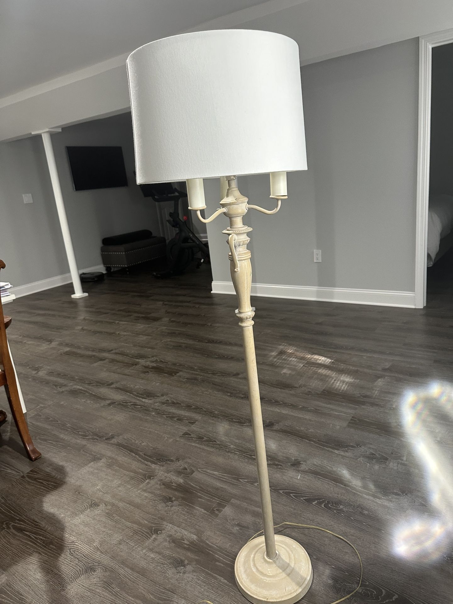 Vintage floor, lamp In washed cream. Has old world time and a brand new lampshade. It is about 5 feet high.