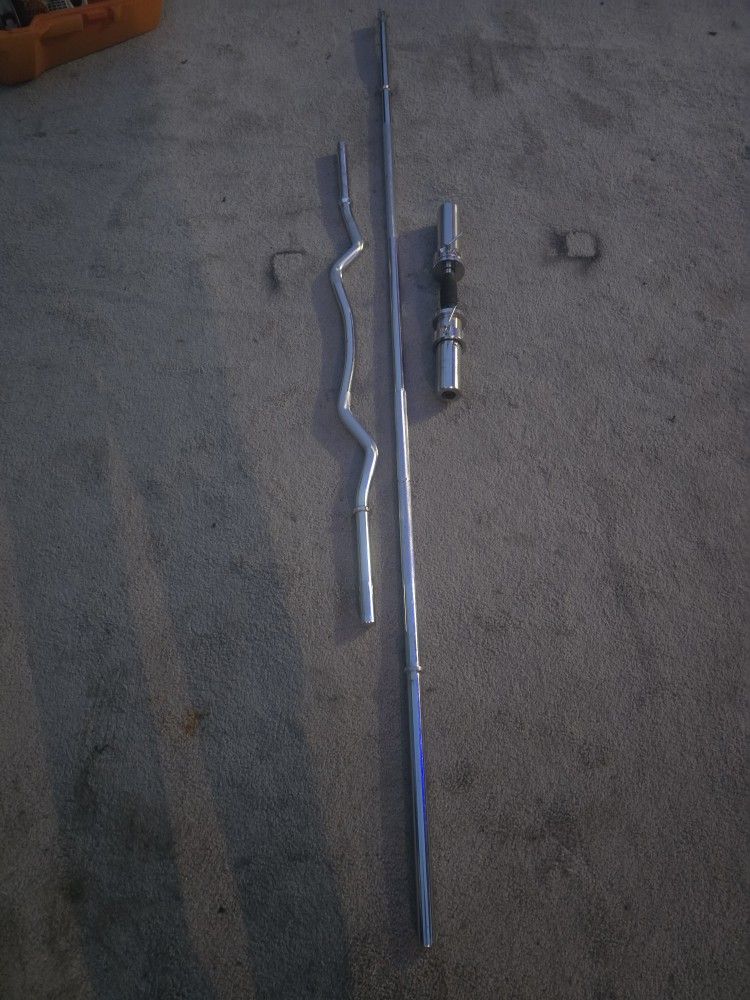 Chrome long straight 7 ft bar 4 ft curve bar and one Olympic dumbbells bar mission the collar lock take all for 65$