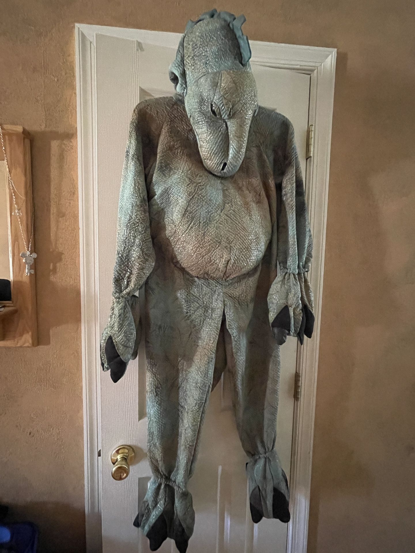 -Pre-owned -From a smoke-free, pet-free home -Child size medium (size 8) -Very cool one-piece back-zip costume -No rips, tears, stains. ‘Scales’ flaking off finger/toe nails (see pic) -As-is final sale