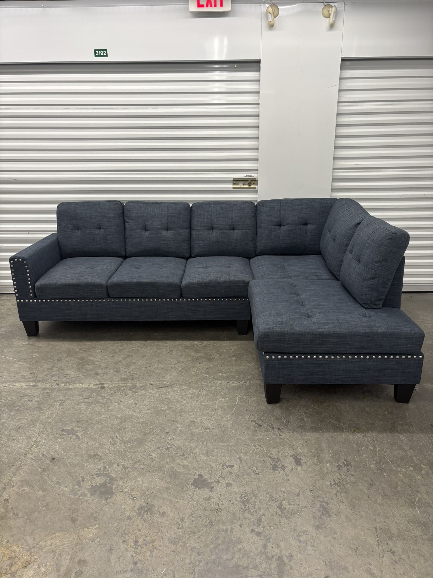Dimensions: 97” x 65” x 35” Modern blue sectional in great condition. Very clean, no rips, no stains. Firm and comfortable cushions with button-tufted design and silver nailhead trim for a stylish look. Perfect size for apartment or living room. Solid frame and ready to go. !!!! Can Deliver !!!!