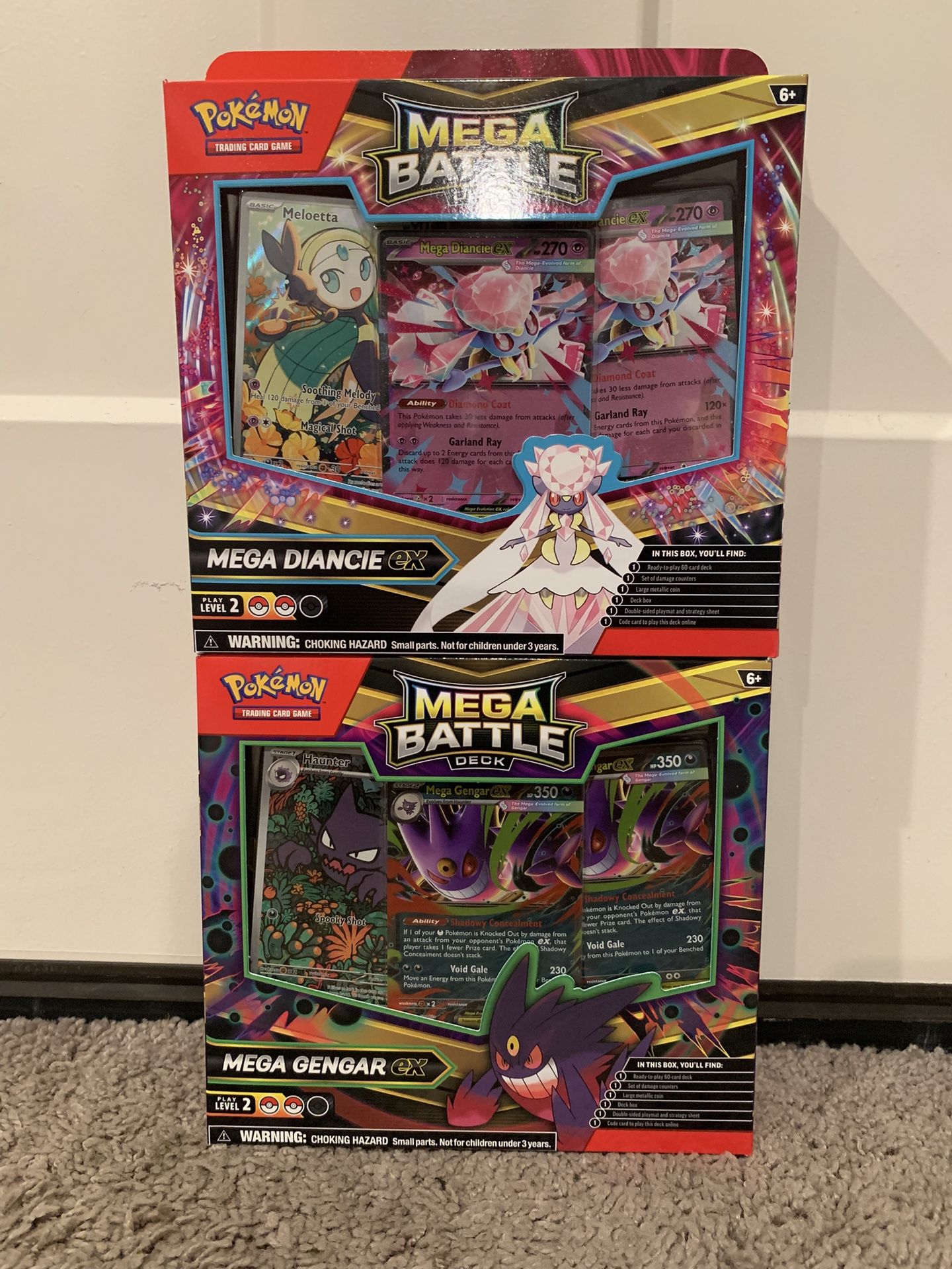 New and still sealed Mega battle deck set. Has both Mega Gengar & Mega Diancie. Promo themselves have a raw value of around $31 combined. Asking $40 and includes: - Hunter Full Illustration Promo - Meloetta Full Illustration Promo - 2 Ready-to-Play 60 Card Decks - 2 Sets of Damage Counters - 2 Large Metallic Coins - 2 Deck Boxs - 2 Double-sided Playmat - 2 Code Card to Play This Deck Online