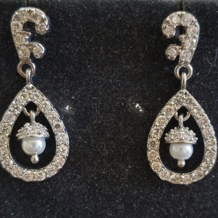 For pierced ears. Silver and Cz with small coultured pearls. Stones are set, not glued.
