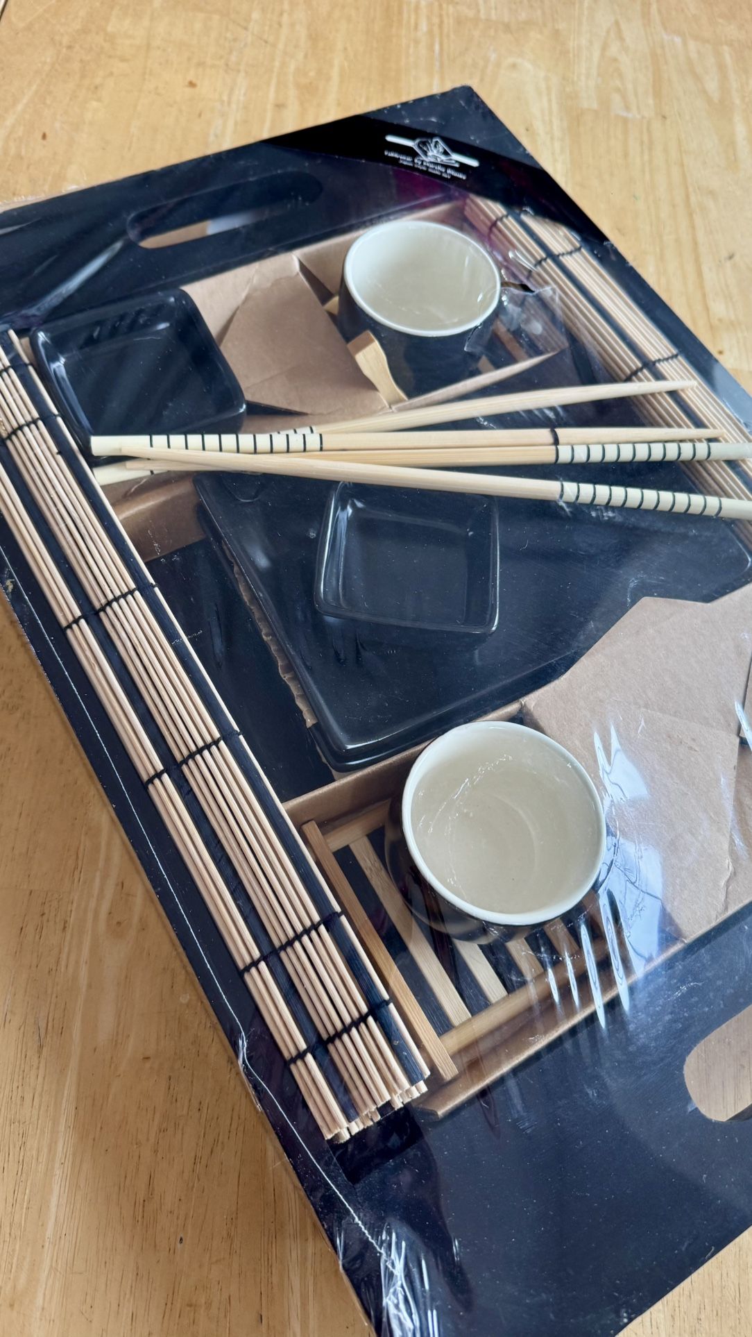 * Great as Christmas, White Elephant, Secret Santa, House warming, birthday gift * Brand new, Unopened box * Chopsticks with stands * Tea/sake cups * Bamboo mats * Wasabe/soy sauce mixing tray * Dinner plates