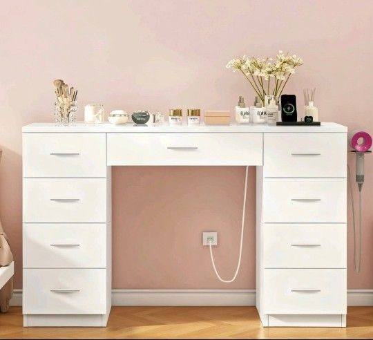 9 Drawers Makeup Vanity with Charging Station, Vanity Desk,writing desk