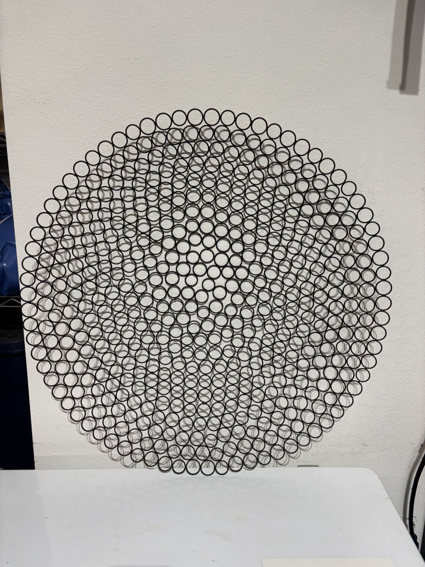 Round metal artwork, looks great as a centerpiece above a bed or mantle Its dark/wrought iron brass color would match with brown or black! Hangs with a nail
