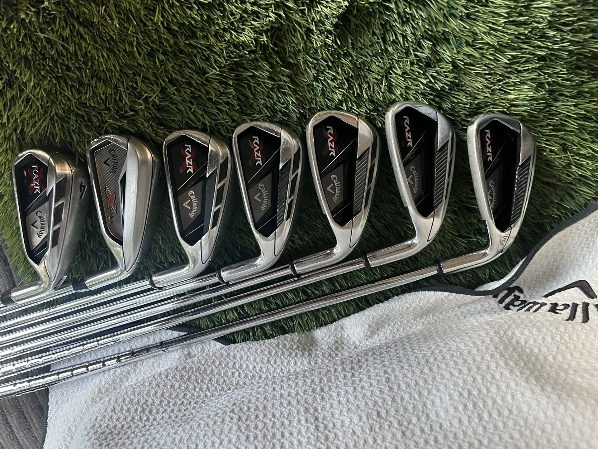 Nice set Callaway RAZR. In great condition, very clean nice groups ready to swing. 4 5 6 7 8 9 pw. / with steel shaft uniFlex nice grips plus (2) wedges 60 56. Plus putter. Driver. XR 10:5 callaway. 3 wood callaway. 5 hybrid MAVERICK. Nice golf standing bag. Callaway