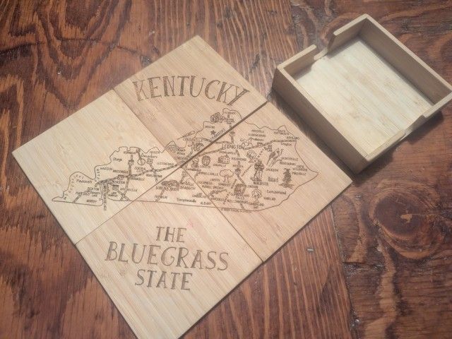 Wooden coasters with Kentucky map design.