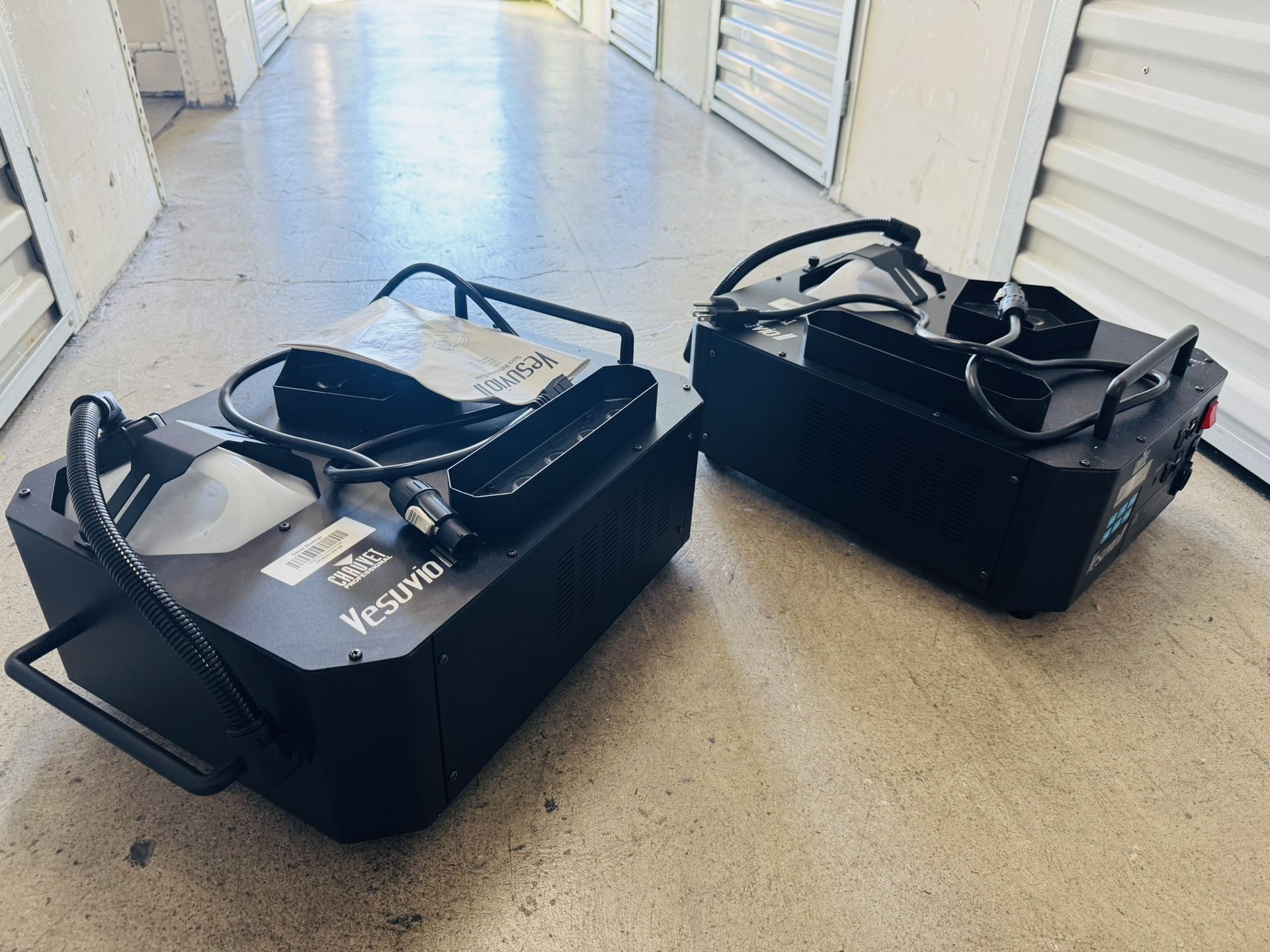 Set of Two Chauvet Pro Vesuvio II 1400W Water Based Vertical Foggers. These were bought for a tour, opened, but never used. These sell new in box for over $900 each The Vesuvio II fog machine by Chauvet Professional illuminates bursts of color mixed fog to provide exuberant effects for events and performances. It bursts 40 seconds of full output fog and features an impressive 40,000 cubic feet of fog per minute. Achieve greater creative control from this machine with the new dual LED sections for a more even coverage of light. Consuming only 80ml per minute of QDL fluid, the Vesuvio II is built for efficiency. This highly versatile unit can run in three different positions: vertically, horizontally, or from overhead with mounting brackets. Use the Chauvet HDF high-density fluid and QDF quick dissipating fluid for best results. Includes: Vesuvio II Seetronic Powerkon IP65 power cord Features: Red, green, blue, amber, and UV (RGBA/UV) LED color mixing 40 second continuous bursts of fog, for intense effects and performance 40,000 CFM fog output for intense, large effects 2.5 l fluid tank for reliability in production Strong, sturdy construction for numerous production types DMX control for ease of use in production situations 3- and 5-pin DMX input/output connections Specifications: Optical: Light Source: 10 LEDs (RGBA/UV) 8.5 W, (3 A), 50,000 hours life expectancy Illuminance (Center): 199.5 lux @ 5 m Illuminance (Linear): 154 lux @ 5 m Illuminance (Both): 334 lux @ 5 m PWM Frequency: 126 Hz Dynamic Effects: Dimmer: Electronic Shutter/Strobe: Electronic Strobe Rate: 0 to 20 Hz Output: 40,000 cfm Low Fluid Shutdown: No Construction / Physical: Dimensions: 19.49 x 13.18 x 9.39 in (495 x 335 x 239 mm) Weight: 28.4 lb (12.9 kg) Exterior Color: BLACK Housing Material: Steel Tank Capacity: 0.7 gal (2.5 l) Fluid Consumption: 80 ml/min Connections: Power Connection: Edison plug to Seetronic Powerkon IP65 Power Input: Seetronic Powerkon IP65 Data Connectors: 3- and 5-pin XLR Cable Length (power): 5 ft (1.5 m) Control: Control Protocol: DMX DMX Channels: 15 Modes/Personalities: 1 personalities On-Board Control: Yes Included Remote: No Electrical: Input Voltage (120V): 120 VAC, 60 Hz Input Voltage (220V): 230 VAC, 50 Hz Power and Current (120V): 1,480 W, 12.55 A @ 120 V,60 Hz Power and Current (220V): 2,880 W, 12.55 A @ 230V, 60Hz Heat-up Time (120V): 10 min Heat-up Time (220V): 10 min Breaker Size (120V): 15A Breaker Size (220V): 15A Certifications / Qualifications: CE IP Rating: IP20, dry location Temperature (Ambient): -4 °F to 113 °F (-20 °C to 45 °C)