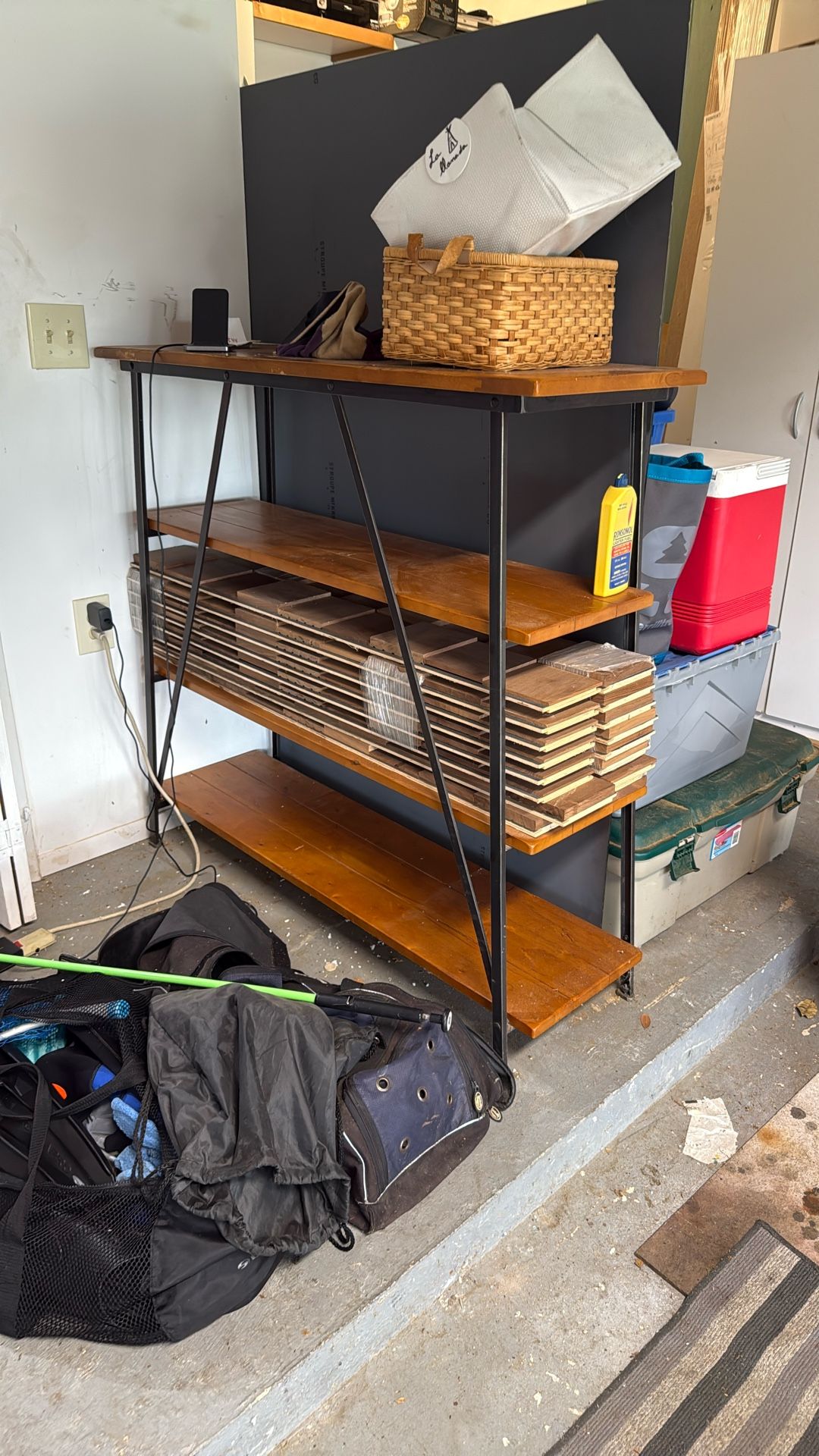 Wood and metal Pottery Barn shelves. Originally $450. Like new