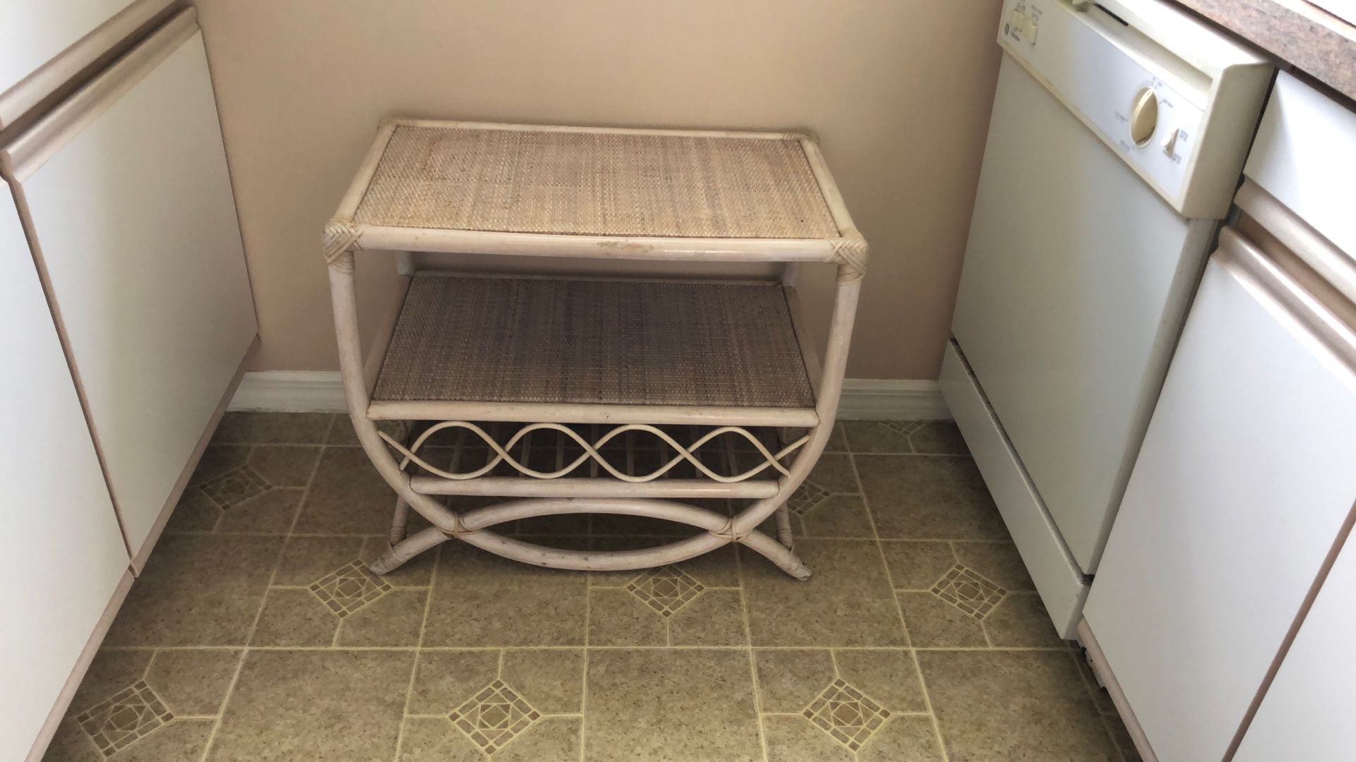 26 wide x 16 deep x 22 tall. Cute. Holds 4 bottles of wine at bottom. Great for a lanai