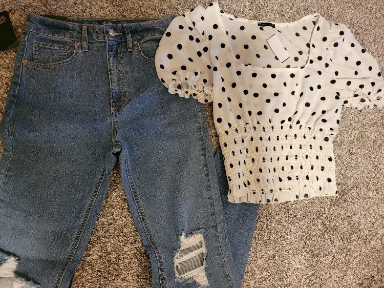 New jeans and blouse, with tags. $15 for both or separately $5 for jeans, and $10 for blouse).
