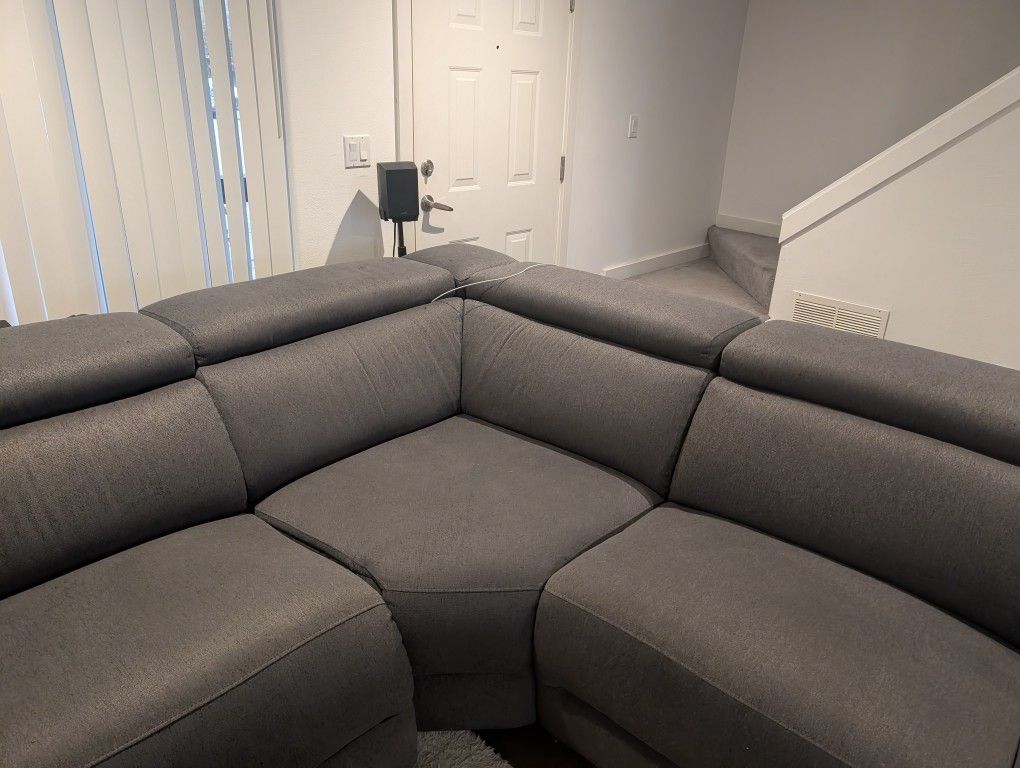 Selling a spacious, L-shaped grey fabric sectional. It features adjustable headrests for extra comfort and a clean, modern look. The fabric is durable and comfortable, perfect for a main living area or family room. Condition: Good used condition, well-maintained.Comes from a smoke-free home & pet free Color: Grey Logistics: Local pickup in Bellevue. You will need a truck or large van to transport it, as it comes in pieces. Cash or Venmo preferred