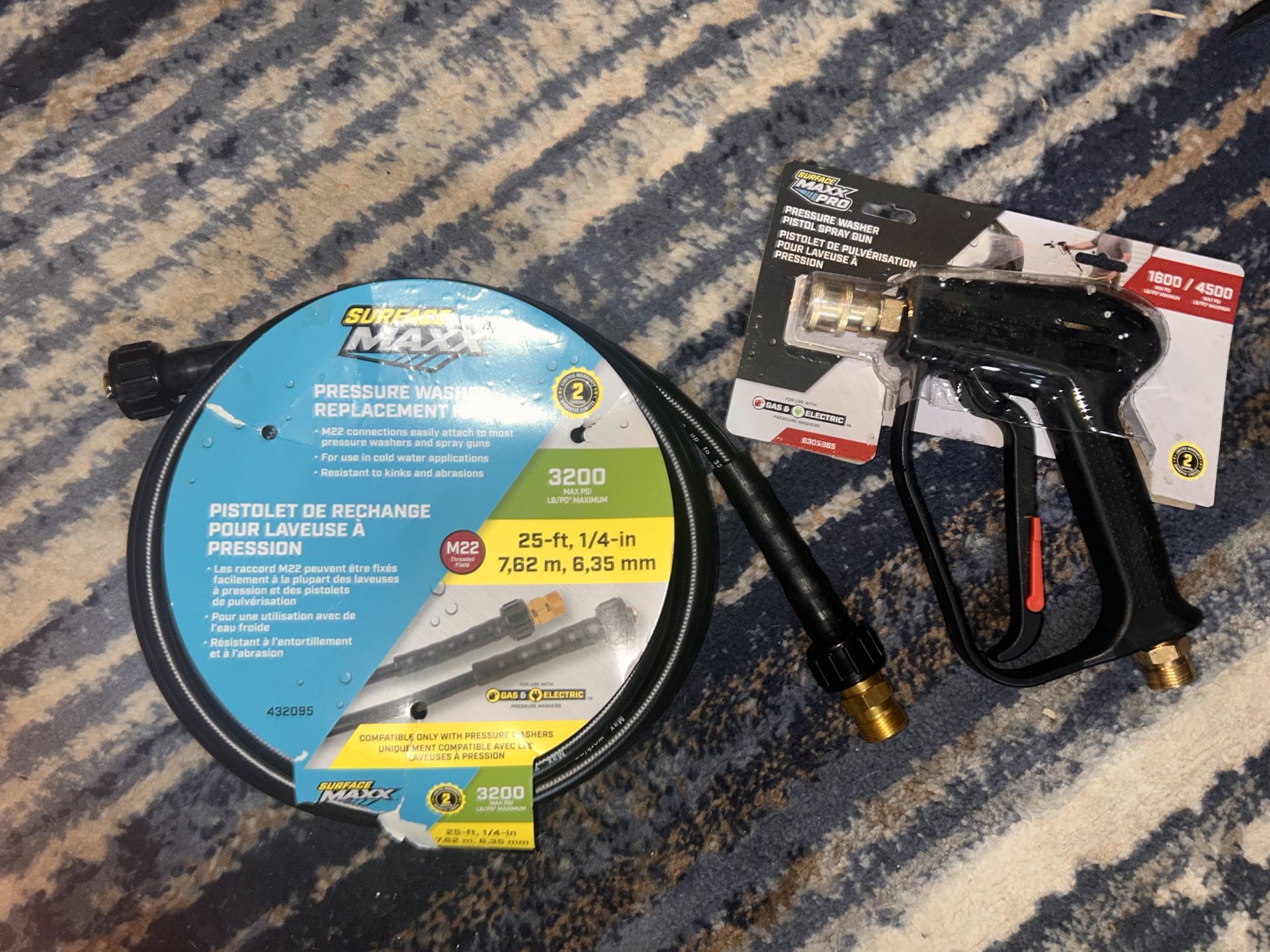 Upgrade your pressure washing setup with this high-quality SurfaceMaxx PRO kit. These parts are more durable and ergonomic than the standard accessories that come in the box with most pressure washers. What’s Included: SurfaceMaxx PRO Pistol Spray Gun: Professional-grade "stubby" style gun. Rated for 1600–4500 PSI. Features a 1/4-inch brass quick-connect for easy nozzle/foam cannon swaps and an easy-pull trigger to reduce hand fatigue. SurfaceMaxx Replacement Hose: 25-foot length, 1/4-inch diameter. Rated for up to 3200 PSI. Made of abrasion-resistant, anti-kink PVC with heavy-duty bend restrictors for steady water flow. Compatibility: Uses standard M22-14mm threaded connections. Compatible with most major gas and electric pressure washer brands (Ryobi, Simpson, Greenworks, Craftsman, etc.).
