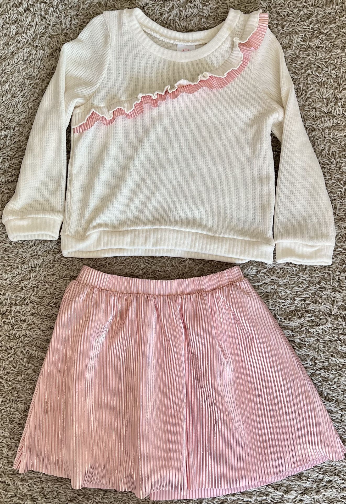 Girls 2 Piece out, sweater is a very soft in the color ivory with pink ruffles on the front, the skirt is pink with gold metallic shine material but soft as well. Skirt is lined on the inside. Only worn twice. In great condition.