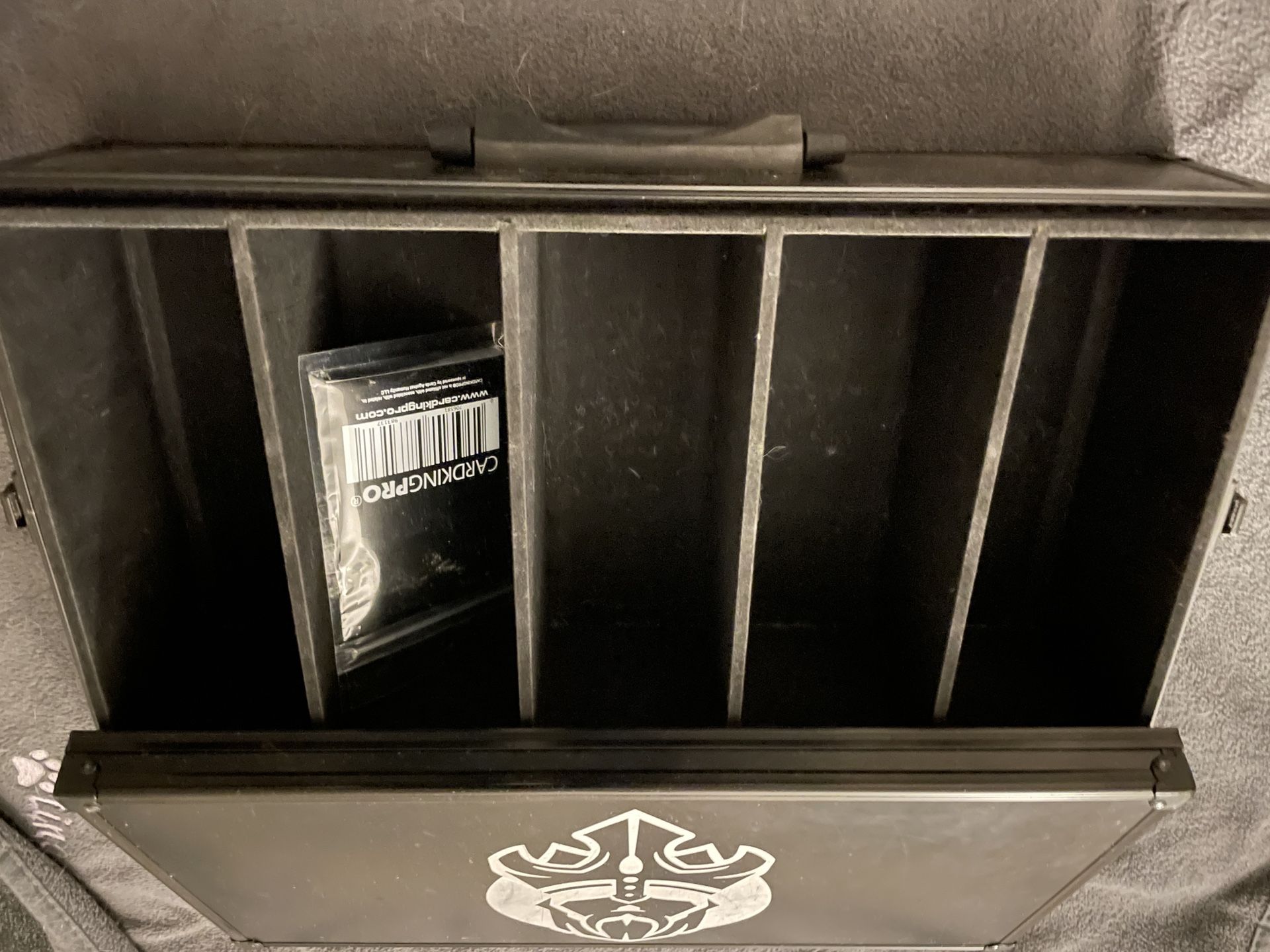 Metal briefcase style deck box/case. 5 rows, standard size. Fits up to 2500 loose cards. Or about 15 decks or so for basic games. Worked great, i just out grew it. Goes for 70 on amazon.