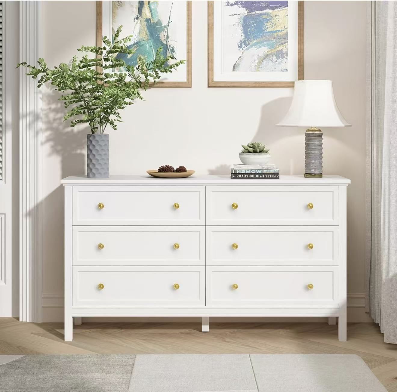 White Dresser for Bedroom, 55 Inch 6 Drawer Dresser with Wide Drawer and Gold Handles, white $160