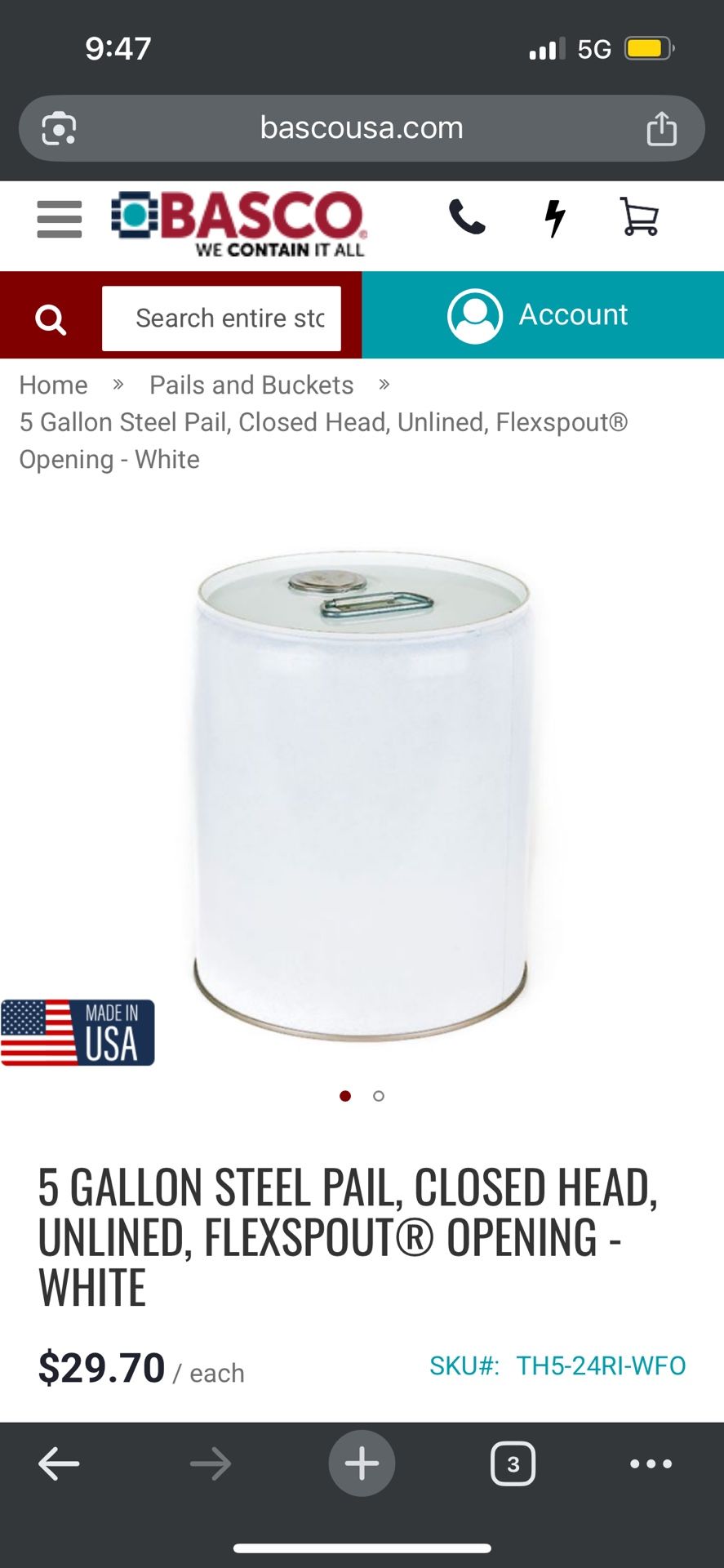 5 Gallon Steel Pail Unlined, Flexspout, Opening, White. I have 2 pallets of 36 pails each pallet. I have a total of 85.