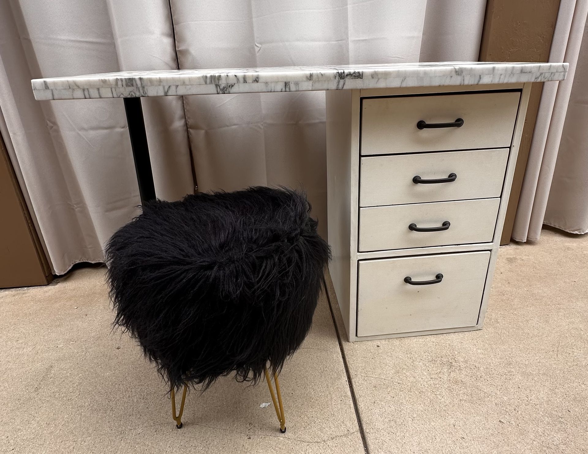 Vanity with chair, marble granite slab stone top with 4 drawers. Chair has storage in the seat. Chair measurements are 18” height by 13.5” width. Vanity measurements are 44” width, 20” depth, 31.5” height.