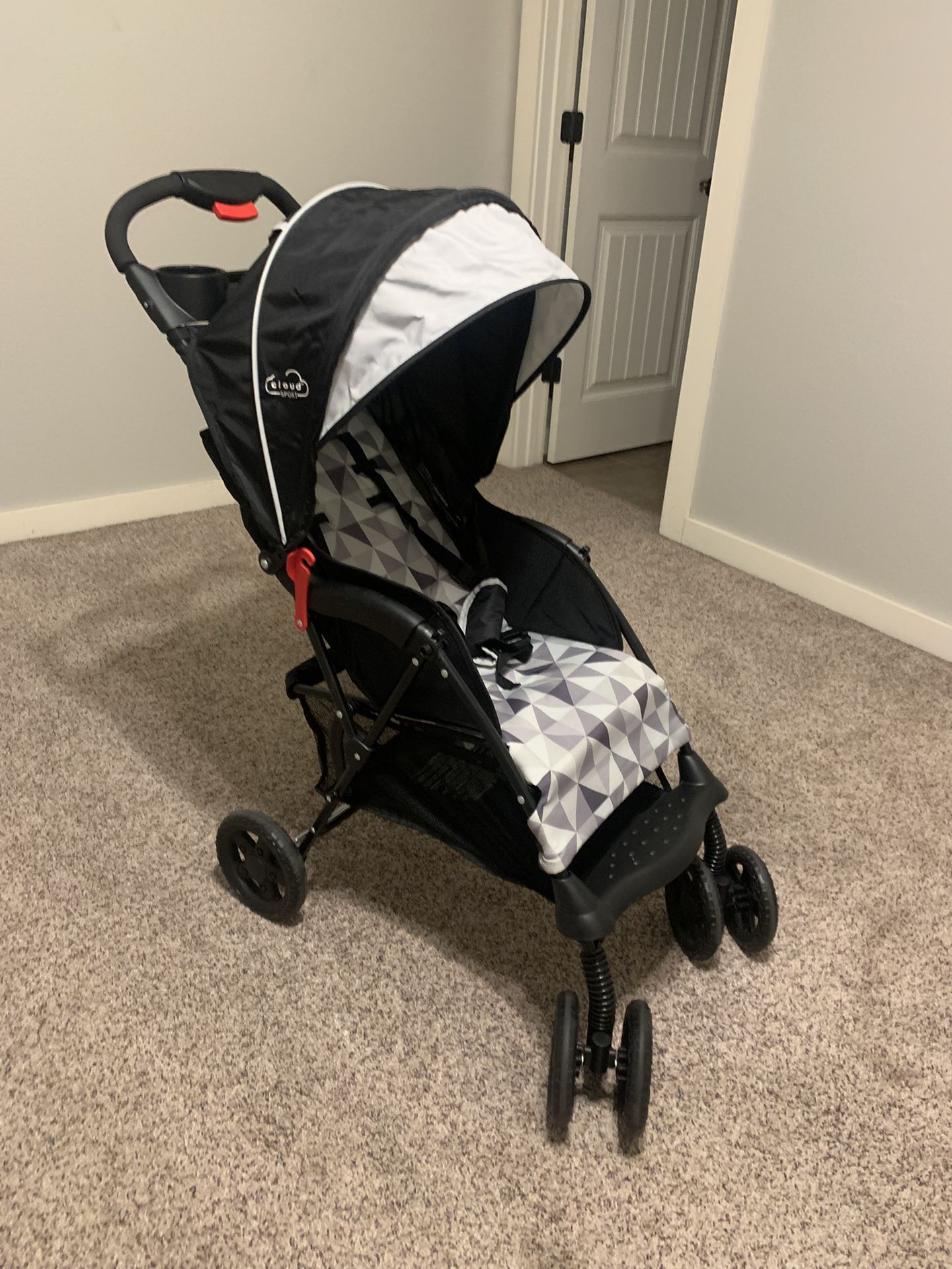 The Kolcraft Cloud Sport Lightweight Travel Stroller, gray, is the ideal stroller for parents looking for something with all the features they need but lightweight and travel-friendly. The Cloud Sport unisex stroller weighs less than 13 pounds, so it's easy to carry, store and transport. It has all of the important full-size stroller features but in a smaller, more nimble design with an ultra-compact fold. This stroller boasts a three-tier extended canopy for maximum UV protection and a peek-a-boo window so your child is visible at all times. The multi-position reclining seat has a five-point safety restraint system that helps keep your child in place, and can fit a child up to 50 pounds. The Kolcraft Cloud Sport Lightweight Stroller has both a child tray and a parent tray for easy storage while you are on the move, plus an extra-large storage basket to keep all your things handy while on the go. (Only used one time for my four year old at an Aquarium.) -Expandable Canopy & Recline Comfort -Peek-A-Boo Canopy With Mesh for Airflow -Ultralight Weight -Parent Organizer -Large Storage Basket