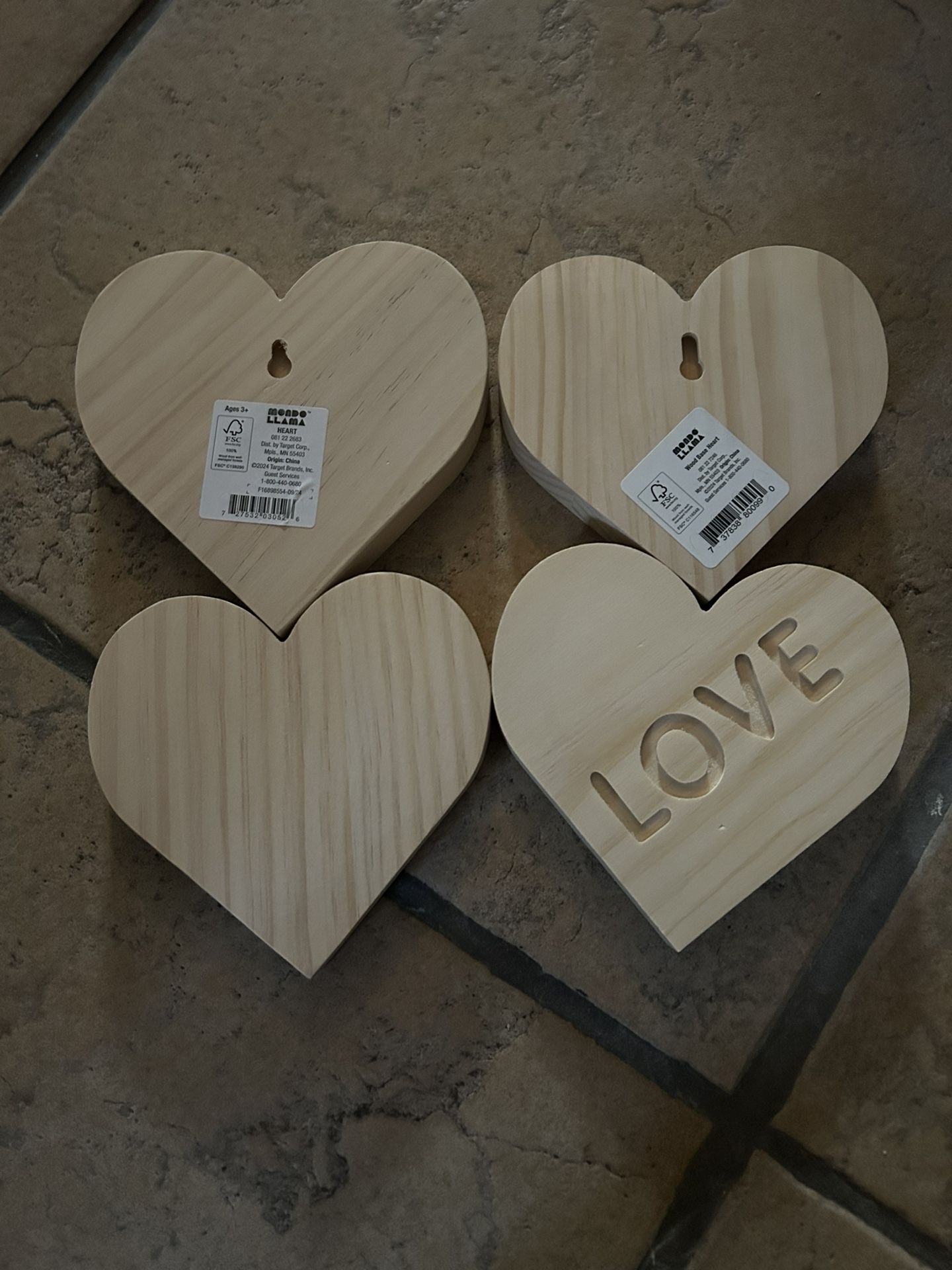 Set of 4 mondo llama wooden heart-shaped decor pieces, one with 'LOVE' engraving.