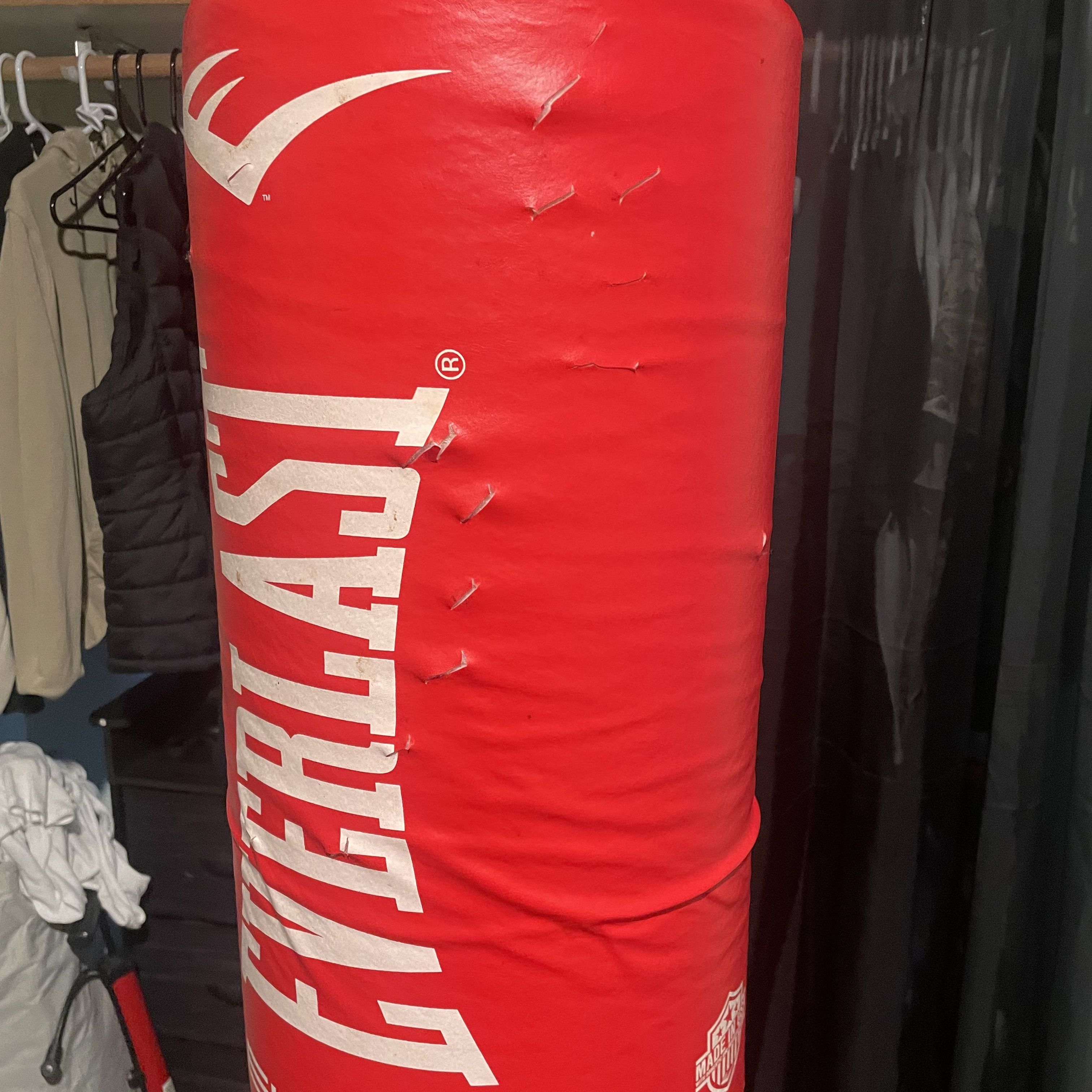 Red cylindrical Everlast punching bag with white logo branding. Heavy-duty construction for boxing and martial arts training.