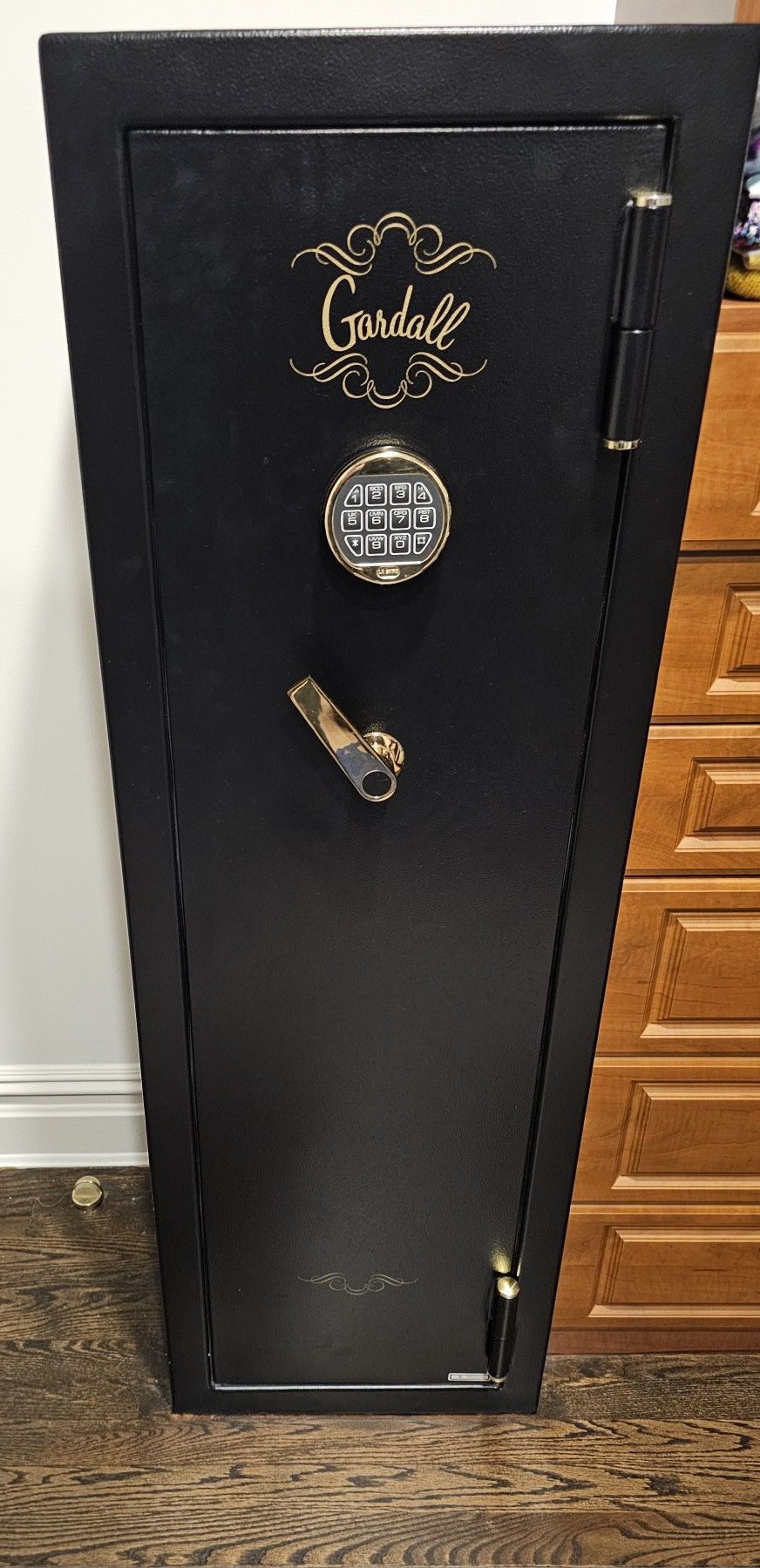 Gardall GF5517 Gun Safe-With Pocket Door Organizer-Black/Brass. Excellent condition. Lost code to safe. But it's open. I changed the battery, but code must be reset. It can be reprogrammed with a master key by a locksmith. A professional locksmith can reprogram, reset, or change the combination. Keypad model: La Gard 3715 Retails for $1600 w/tax and shipping. Pickup zip code is 11224. Ground floor. It's easy for pickup. Very heavy. Approx. 265 lbs. The Gardall GF-5517 gun safe is designed to be anchored to the floor for added security, featuring 4 pre-drilled anchor holes in the bottom. It is highly recommended to use these holes to bolt the safe to a solid surface to prevent it from being moved or tipped over. Gardall GF-5517 Gun Safe Features: New pocket door organizer included! 3-Way locking bolts (5 active 1" bolts) 3-wheel mechanical lock w/spyproof dial (standard) - electronic lock may be available for additional cost. Please call to inquire. 3 Spoke handle or drop point handle - factory determines - we have no control over this Black powder coated paint with brass accents and brass hardware Safe fits in most standard closets 11 gun slots 4 anchoring holes to bolt safe to floor Carpeted gray fabric interior Fire tested at 1200°F for 30 minutes Outside Dimensions: 55-1/4"H x 17-3/4"W x 16"D Inside Dimensions: 53"H x 16"W x 11-1/2"D Weight: 265 lbs. https://offerup.com/redirect/?o=aHR0cHM6Ly9zYWZlYW5kbG9ja3N0b3JlLmNvbS9wcm9kdWN0cy9HYXJkYWxsLUdGNTUxNy1HdW4tU2FmZS5odG1sP3Nyc2x0aWQ9QWZtQk9vclVjd0FJc1ZKYzJaX2dXNTMzTnlHVjcyUTNBbmswYWx0VFQ5TExuY0xGdlhHSjB1ejY=