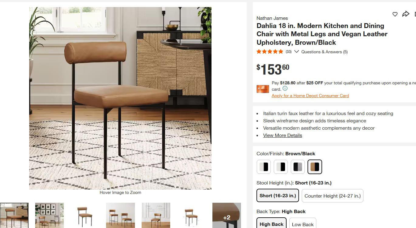 Condition: New, installed 1 chair measurements shown in photo originally 149$ on amz. and 153$ in homedp. Italian turin faux leather for a luxurious feel and cozy seating Sleek wireframe design adds timeless elegance Versatile modern aesthetic complements any decor