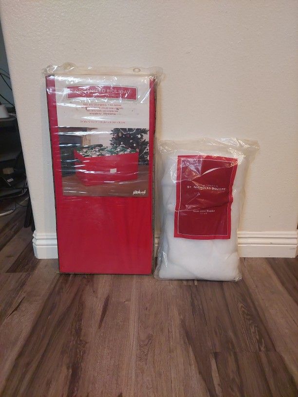 Both are brand new and never used. The St. Nicholas Square Snow Cover Blanket has a tear in the package.
