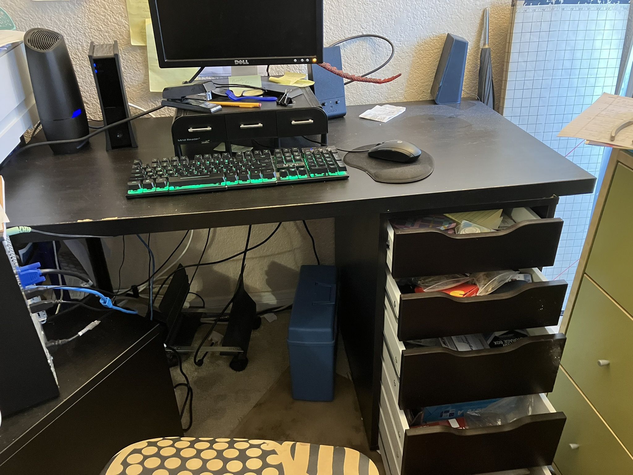 Dark brown wood it is in two pieces for Easy moving. five drawer cabinet fits under the desk portion. Photo shows how it separates 46 in long. 23 1/2 inch deep. 28 3/4 inch high
