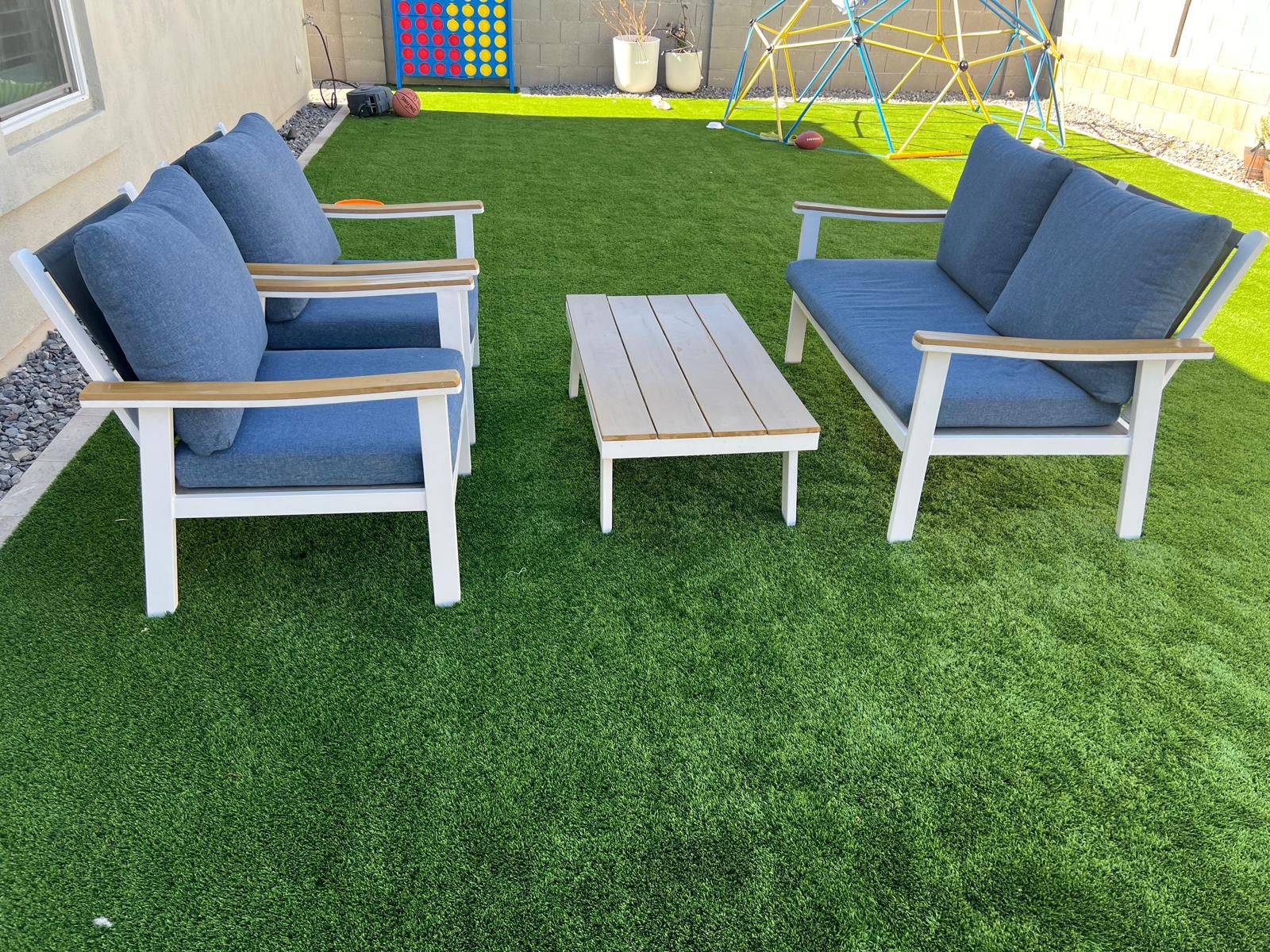 4-piece patio furniture, barely used and looks as good as new. Light weight yet good quality One table , two single seater sofas, one 2-seater sofa