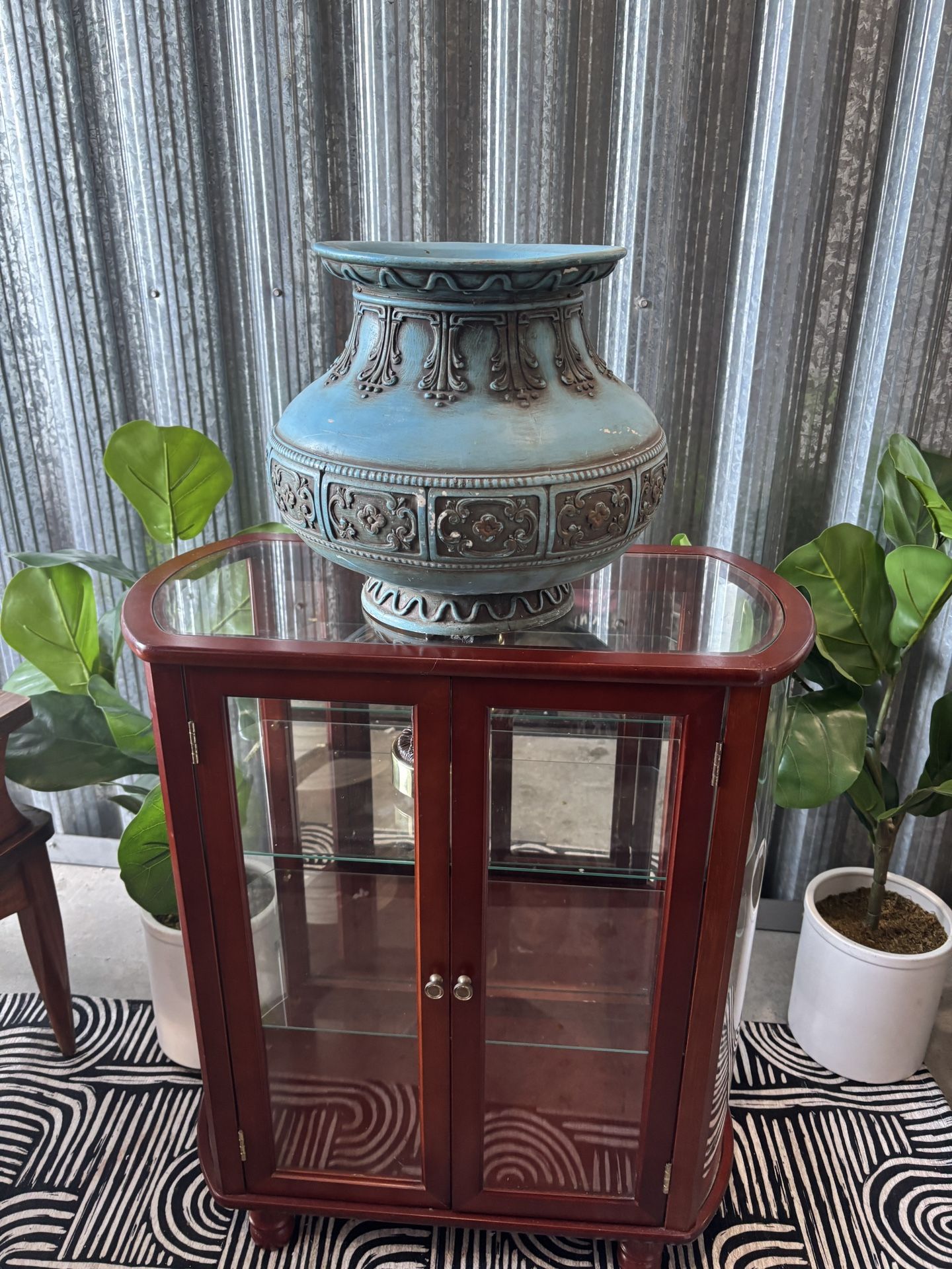 Very light weight Two shelves Beveled shape sides that are plastic not glass 24 x 29 Back to front 12 feet