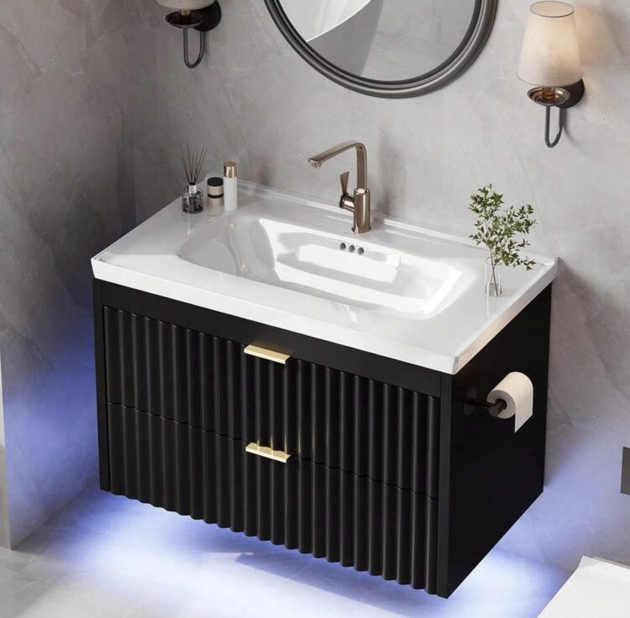 black and white bathroom vanity and sink floating