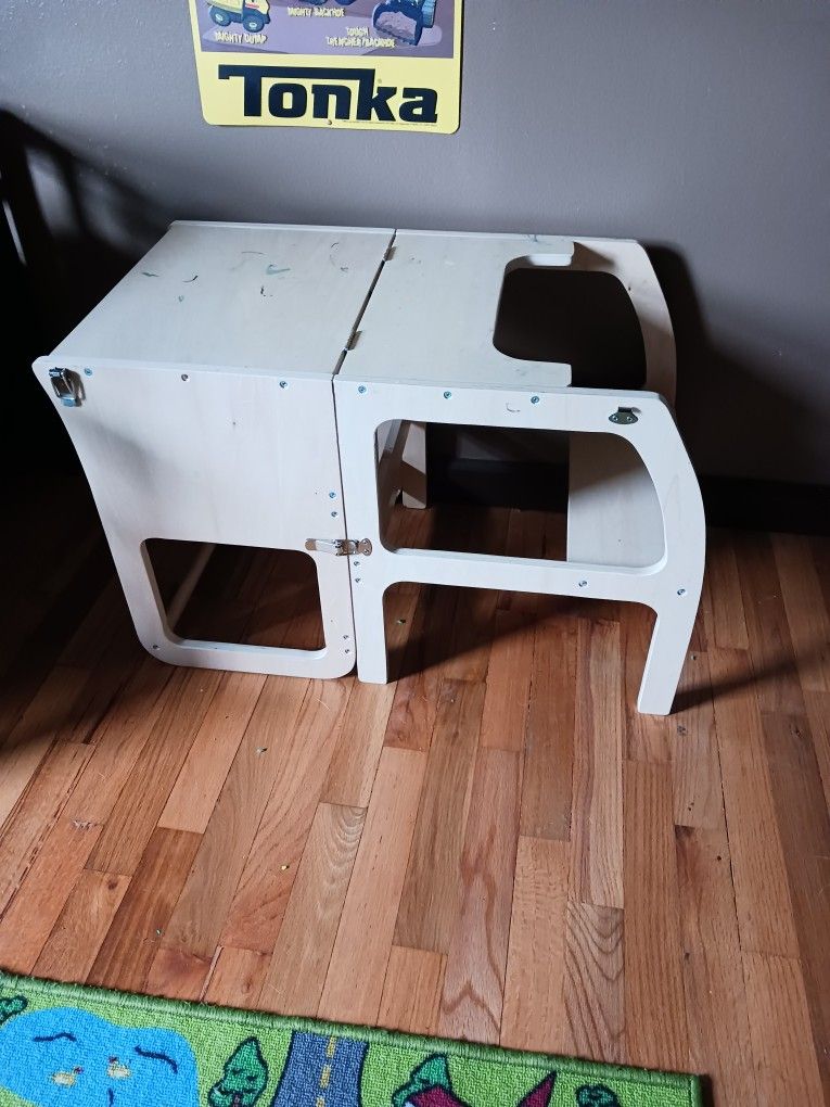 Converts from a desk and seat into a step stool with safety bar. Very useful but my kid is too big for it now. Works perfect. Has a few scribbles on it.