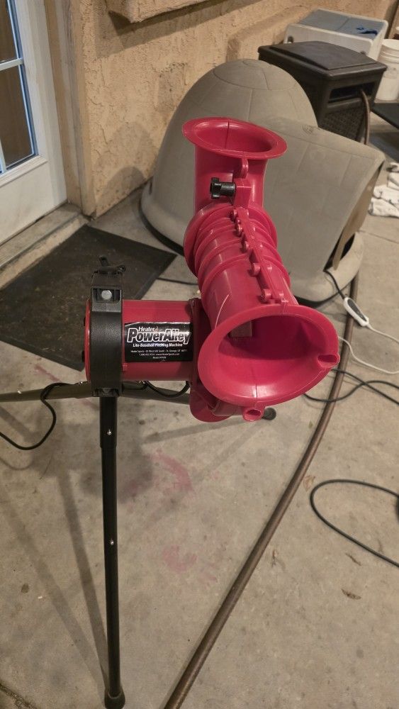 Power alley pitching machine with 10 lite balls. Great for batting practice or grounders. Works will dimpled baseballs only. $80