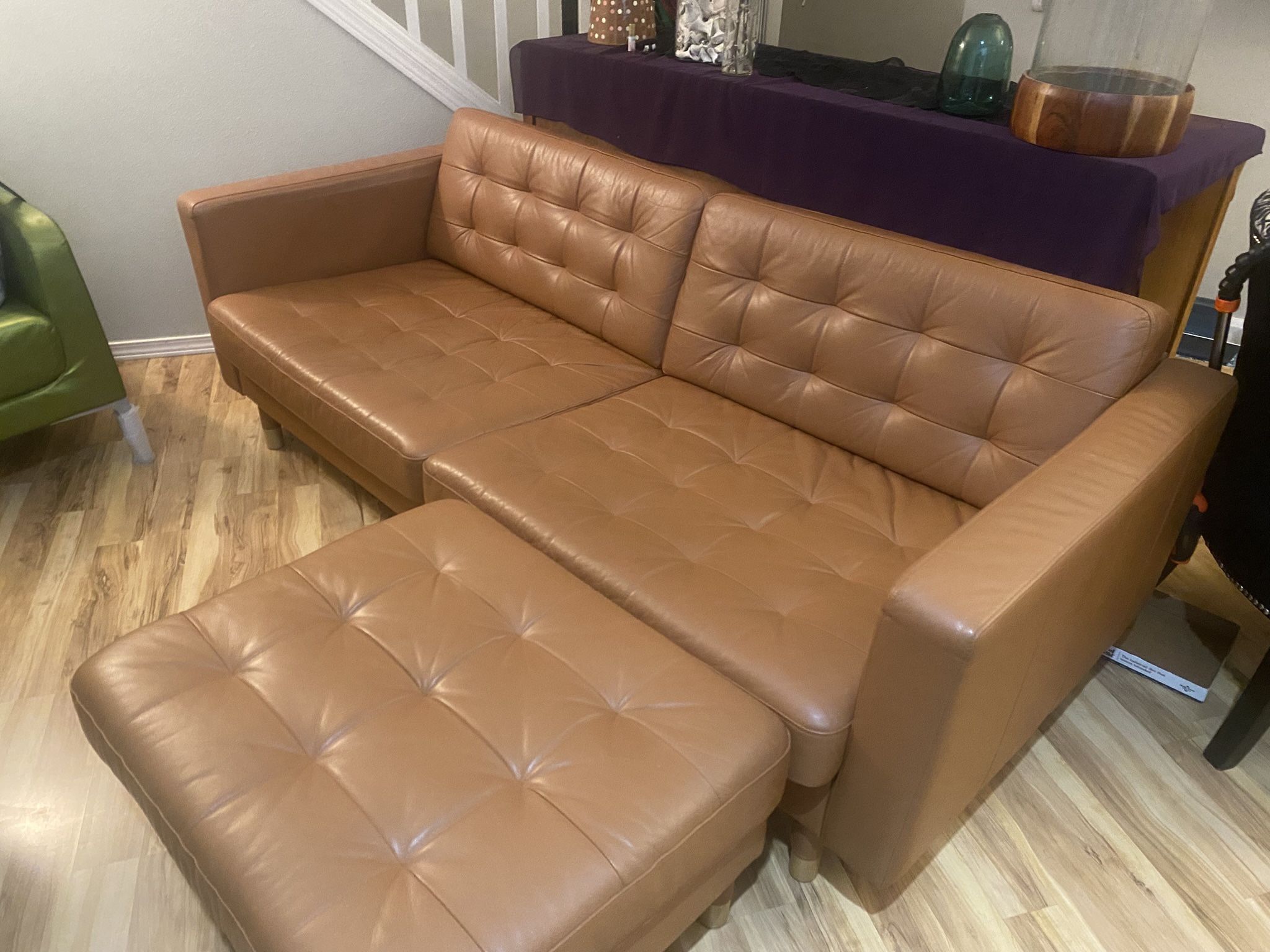 Gently used IKEA Morabo sofa and ottoman set. Ikea currently sells these items separately for roughly $1,700 total. The leather is in great condition and has been maintained throughout ownership. There is some wrinkling of the leather on the seat, but is in otherwise like-new condition. $700 for the couch and $100 for the ottoman, or best offer. Must pick-up (Located in the Raveena/U-District area). IKEA link to exact model listed: https://offerup.co/faYXKzQFnY?$deeplink_path=/redirect/