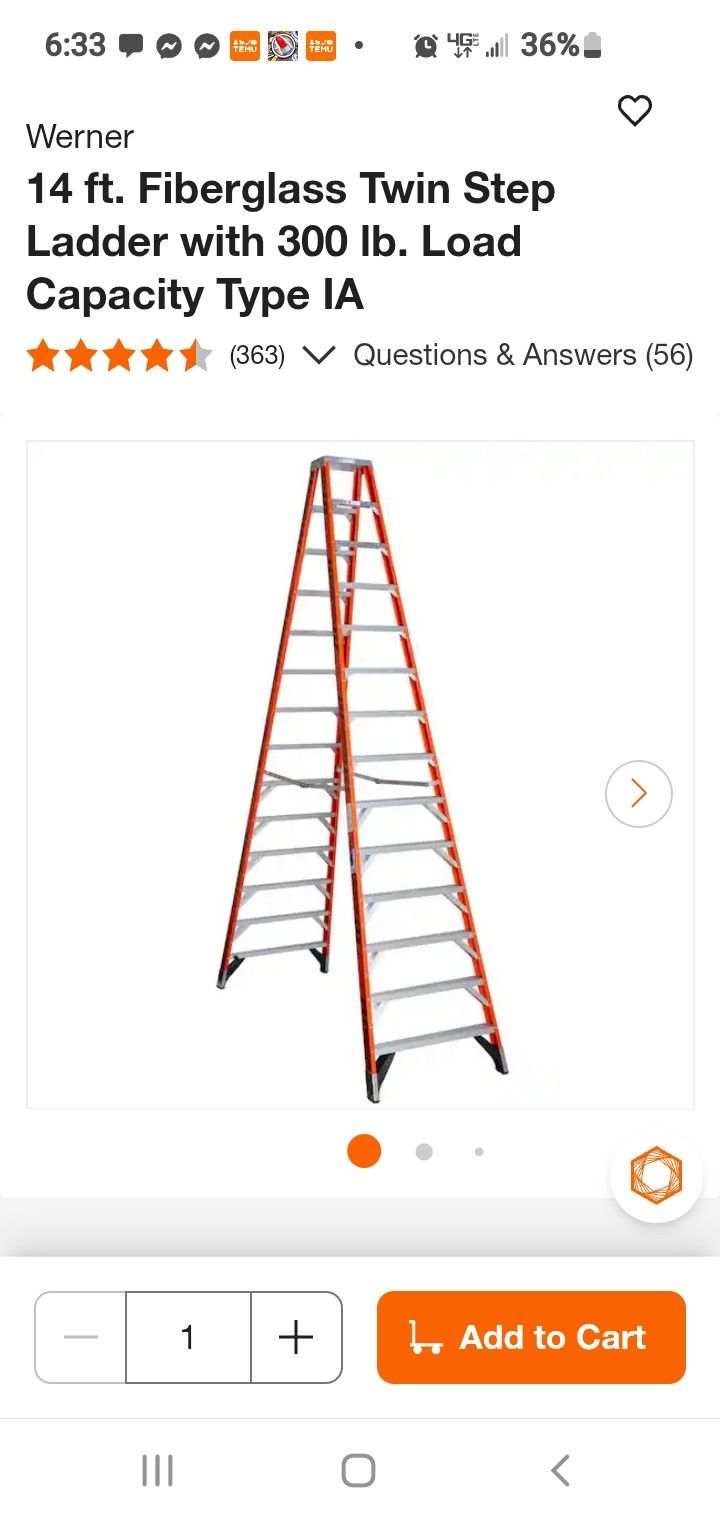 Werner 14 foot fiberglass ladder.. Twin step.. .. Sells for $800+ .. Asking $400 or best offer.. Judy (contact info removed).. It's located at my work in Alpine needs to be gone by Sunday.