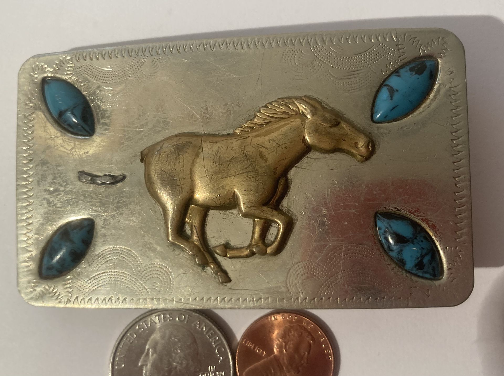 Vintage Belt Buckle Nickel Silver Horse Turquoise
