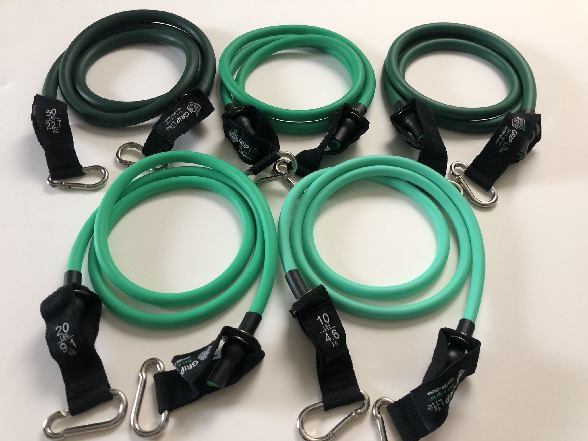 Brand New Multiple Available Non-latex hypoallergenic resistance bands set. Workout in the comfort, convenience, and privacy of your own home with the cable system. Get a total body workout without needing to leave your house! Complete set of (5) bands of various resistance levels, (1) carrying bag, (1) door anchor, (2) hand grips, (2) ankle straps, and exercise guide