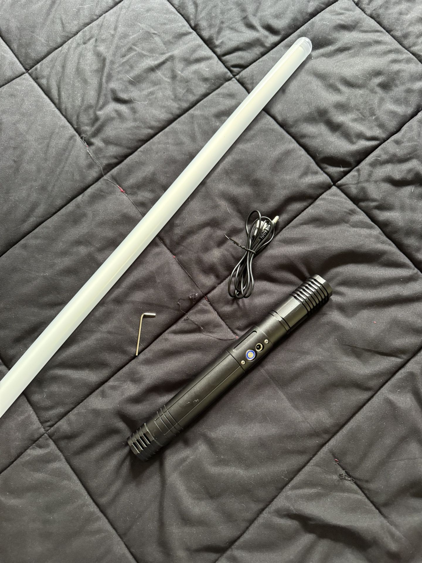 Saberforge Battle Ready Lightsaber Combat ready blade Rechargeable Metal handle Three sound fonts Movement, impact, and deflection sounds Removable blade and cover insert Comes with charging cable and hex key