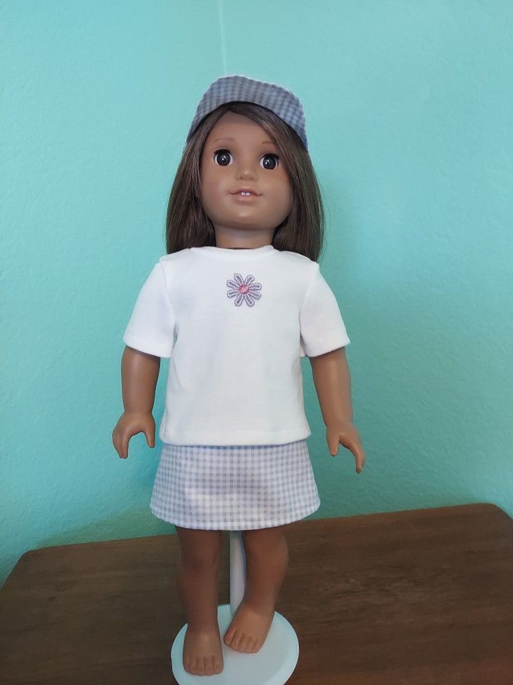 Lavender and white checkered skort with matching baseball style hat. White knit shirt that.easily slips over dolls head and has a lavender flower on the front. Skort has Velcro closure in back.
