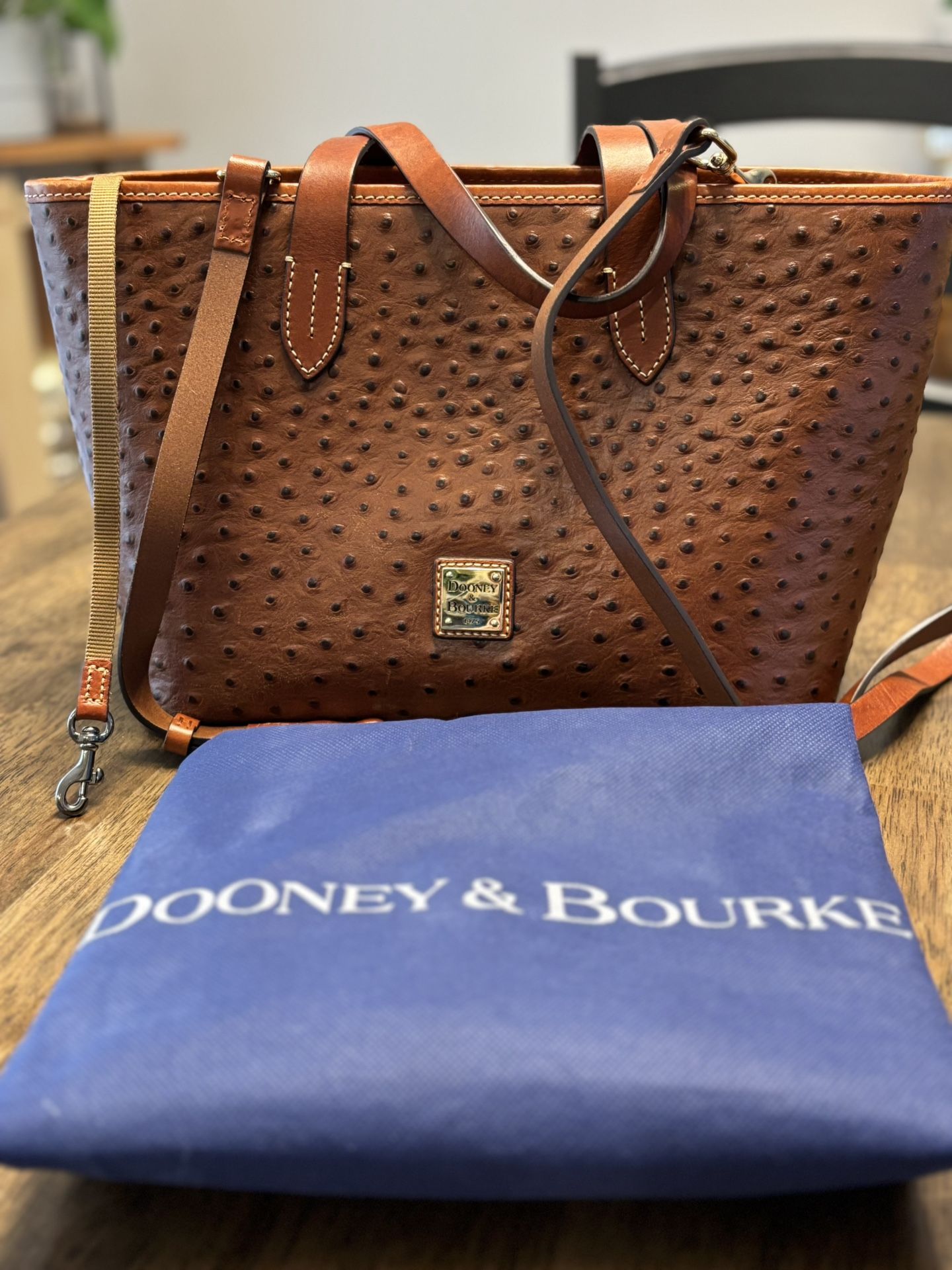Dooney & Bourke Dark caramel sm. Leather Tote with removable cross body strap and key holder. Used- excellent condition. Zipper closure , stand up feet. Comes with Bag protector.