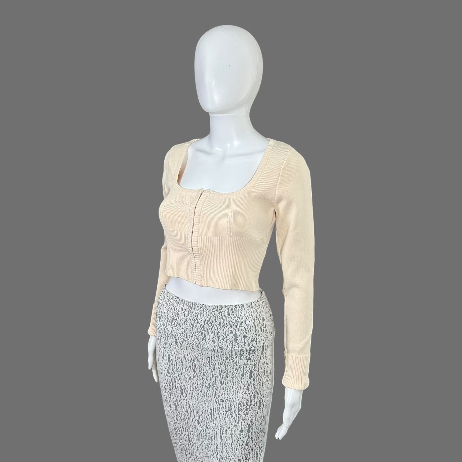 Emory Park Long Sleeve Square Neck Crop Top Beige Corset Closure Sz M - In new, with-tag, newer worn, flawless condition. Will send in retail packaging. Pictures of the actual item, please buy with confidence. - Features long sleeves, cropped length, great for layering, low square neck, corset-type front closure, stretch fabric. - 55.2% Viscose, 44.8% Nylon. - Measures folded: Length 16”; Hem folded 12.5”; Shoulders 12”; Chest 15” (30”R); Sleeve 25”.