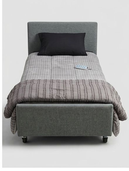 High-end iCare XL (Extra Long) Hi-Lo Hospital Bed. This does not look like a "hospital" bed—it features a sleek, upholstered base in "Smoke" grey that fits perfectly into any bedroom decor. • Adjustability: Fully electric head lift, knee break, and height adjustment (goes very low to the floor for safety). • Size: XL dimensions (35" x 80") for extra legroom. • Condition: Like new, purchased Aug 2025. • Features: Backlit remote, 8 lockable casters for easy moving, and a 440 lb weight capacity. Includes fold-down rails and head/footboards. This is a clinical-grade bed with a luxury home feel. Available 4/15/2026