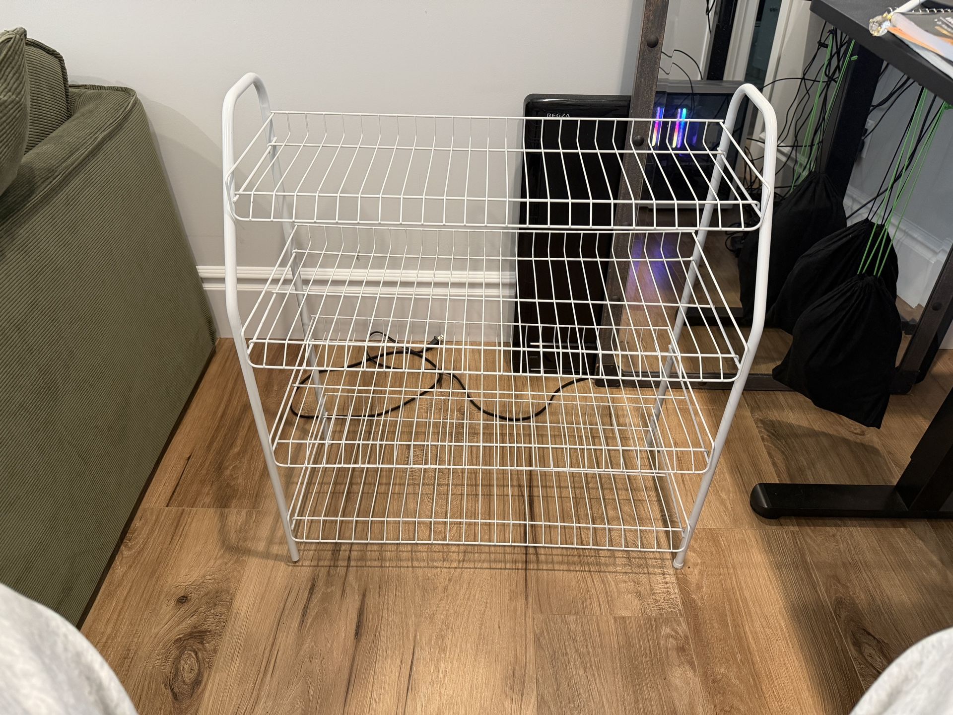 White 3-tier wire storage shelf in good used condition. Simple and useful for pantry storage, bathroom storage, closet organization, laundry room, office, or general home use. Lightweight and easy to move. Clean and ready for pickup. Works well for bins, folded clothes, shoes, pantry items, or supplies.