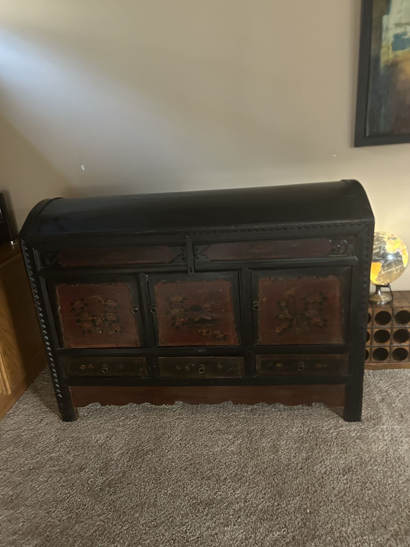 antique Chinese black and red lacquer cabinet or buffet with hand-painted
