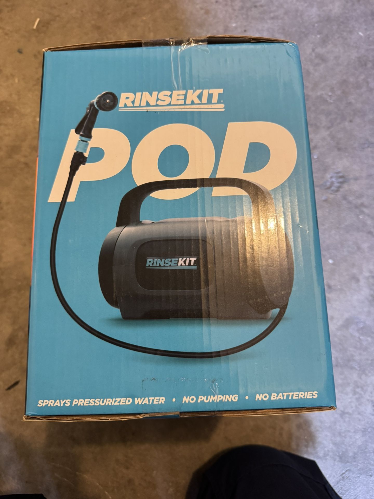 The Rinse Kit Pod Portable Shower is a 1.75 gallon pressurized shower that can be filled with hot or cold water in 30 seconds.