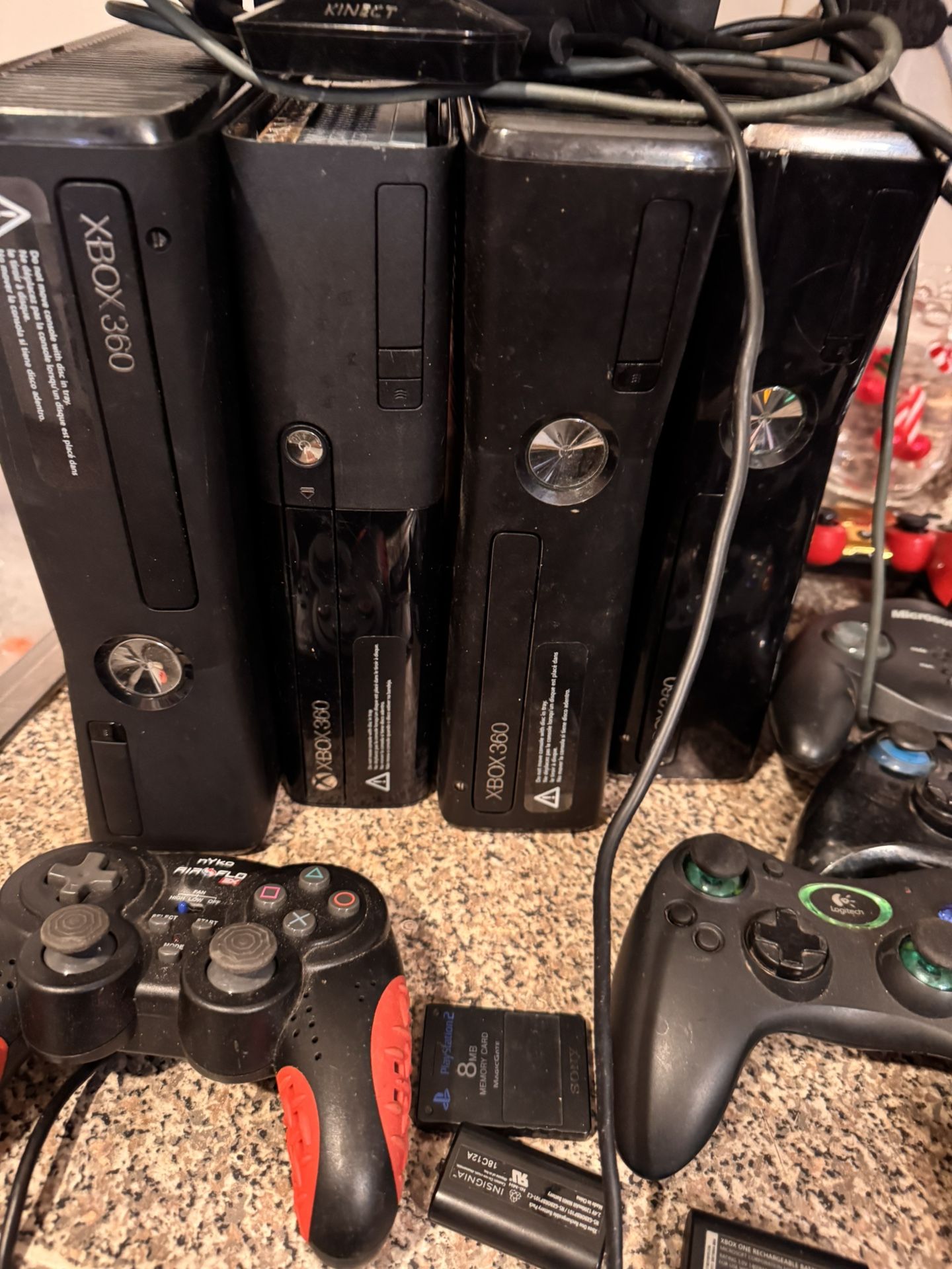Selling Xbox 360’s and games there’s a few PlayStation games and a memory card for a PlayStation and a few controllers for a PlayStation the two game case is pictured on their own have no game inside the game pictured outside of the case has no case everything’s been in storage for a while so it’s a bit dusty and I’m not sure of all the working condition asking $150 for all selling as a lot