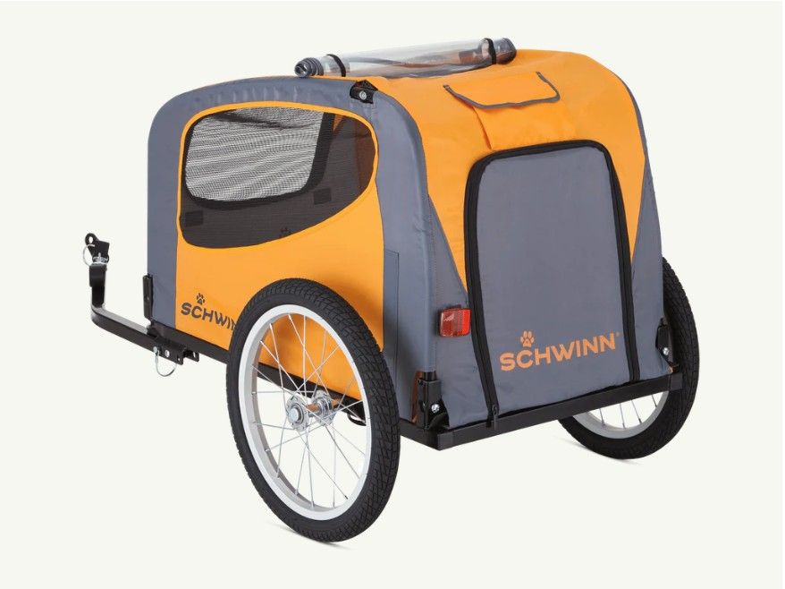 SCHWINN Rascal Bike Pet Trailer Product Key Features: Color: Orange Features: Adjustable Sunshade, Rain Cover, Foldable, Safety Flag Type: Pet Trailer Weight: 27lbs. Dimensions: Height: 19.50in Width: 24.50in Length: 31.75in