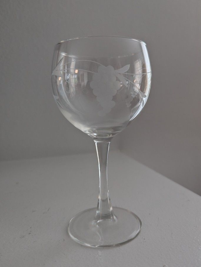 Fourteen beautiful etched crystal wine glasses with grapes and leaves have are barely used and were purchased from Crate and Barrel. These would look so great mixed with other vintage glasses for a wedding or shower, or to dress up your holiday table. Located at Yarrow Bay in Kirkland. Cash only.