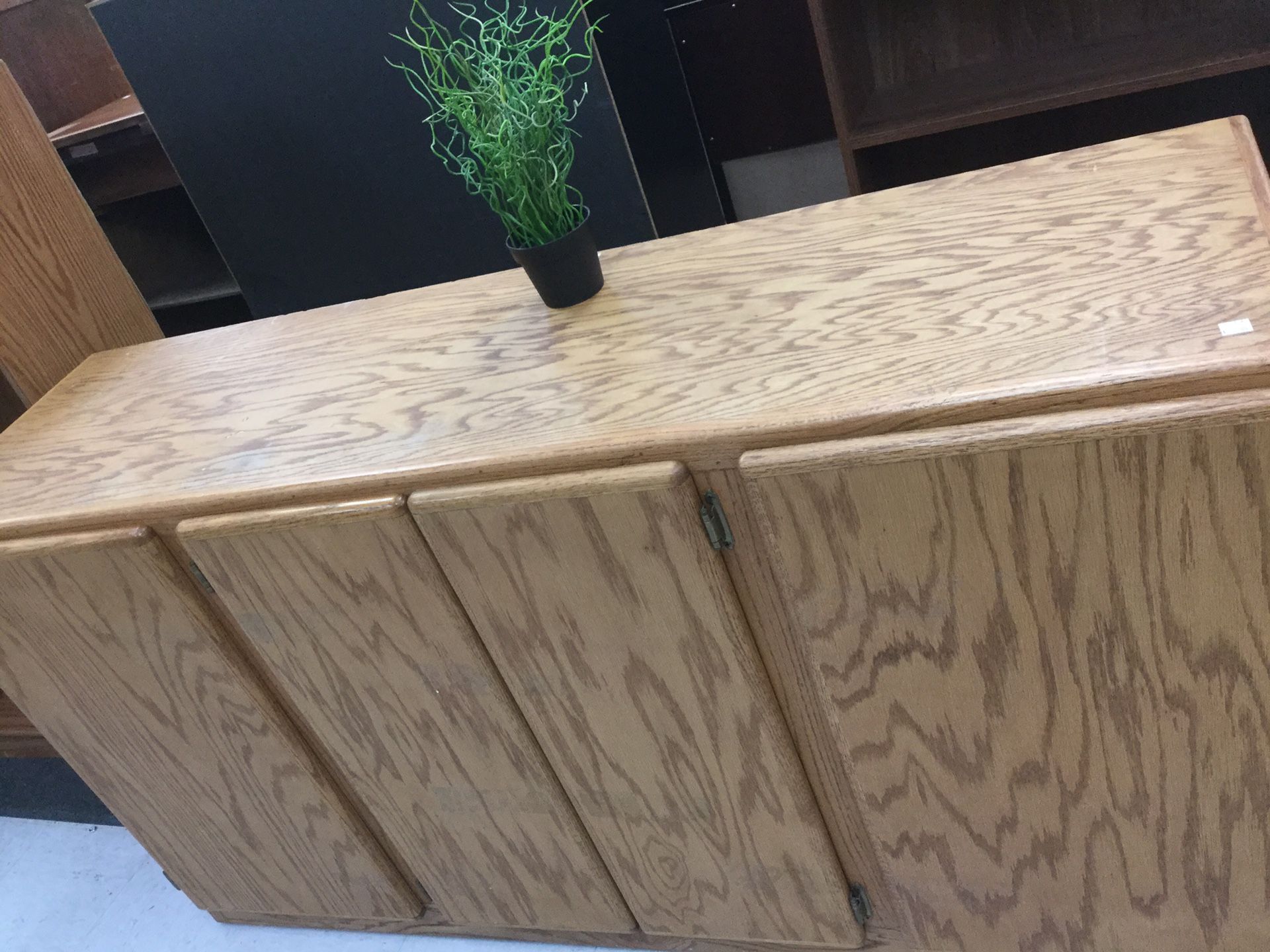 Lovely oak grain credenza/cabinet in excellent condition. The dimensions are 60” W x 31” H x 18” Deep. Ample space to hold all your media and other stuff. Cash only, no exceptions.